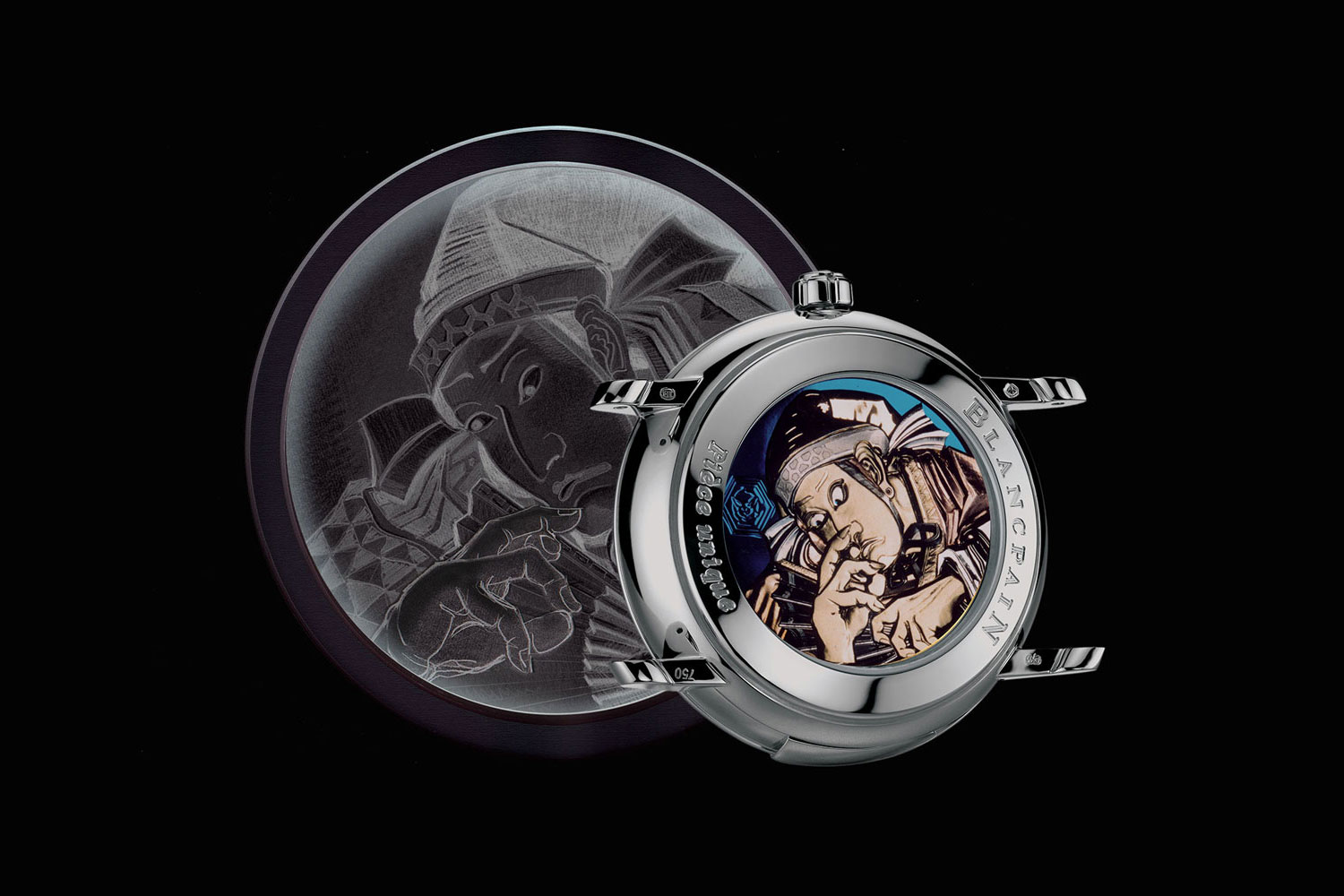 This animated automaton was created for the Japanese market and was inspired by Kabuki theatre graphic representations. The image is placed on the reverse of the minute repeater watch and comes alive with each ring. Kabuki is the result of a long-term collaboration with Blancpain and is one of the several hundred unique pieces produced to date by Jean-Vincent Huguenin.