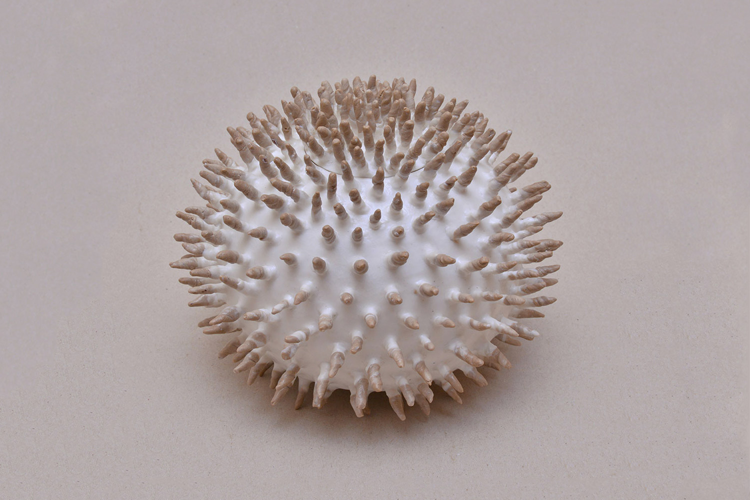Margarita drew her inspiration for this delicate porcelain sculpture from the spiky form of sea urchins. After creating an initial form, she made hundreds of small, individually flattened pieces of porcelain and added them to the structure, giving it this final form.