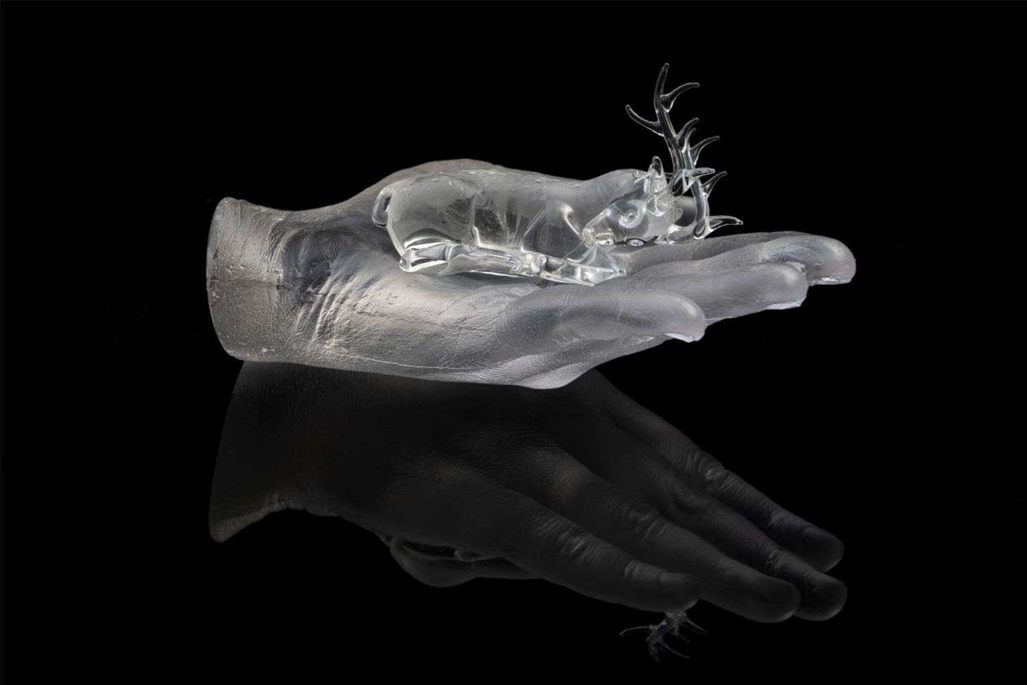 Hands can be used to express oneself in a way that words often cannot. As a maker, Effie is interested in the skills that hands have learned and how these skills change over time. Here, the viewer is able to look inside this cast glass hand, which holds a lampworked glass deer. The animals in Effie's works are archetypes and act as messengers or promises, common motifs across diverse cultures.