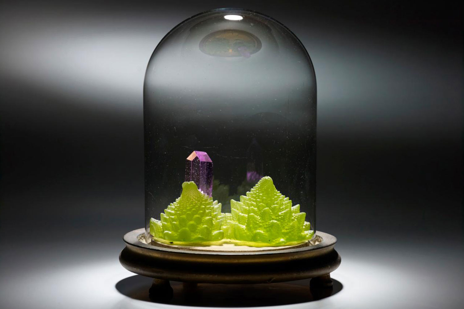 Effie's Undercover series explores the beauty inherent in duality. She often models her sculptures on ordinary items such as vegetables to create extraordinary cast glass landscapes, where forms are not always what they seem. This work, presented under an antique glass dome on a wooden base, miniaturises a landscape and brings it into a domestic space.