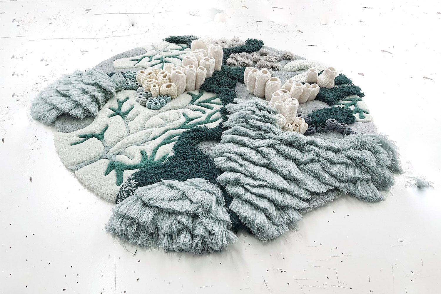 With this Ocean rug, Vanessa focuses on marine pollution. The textile industry being one of the most polluting industries in the world, it particularly affects the oceans. In her own production, Vanessa tackles this problem by using only recycled organic materials and traditional craftsmanship techniques like hand tufting and crocheting.