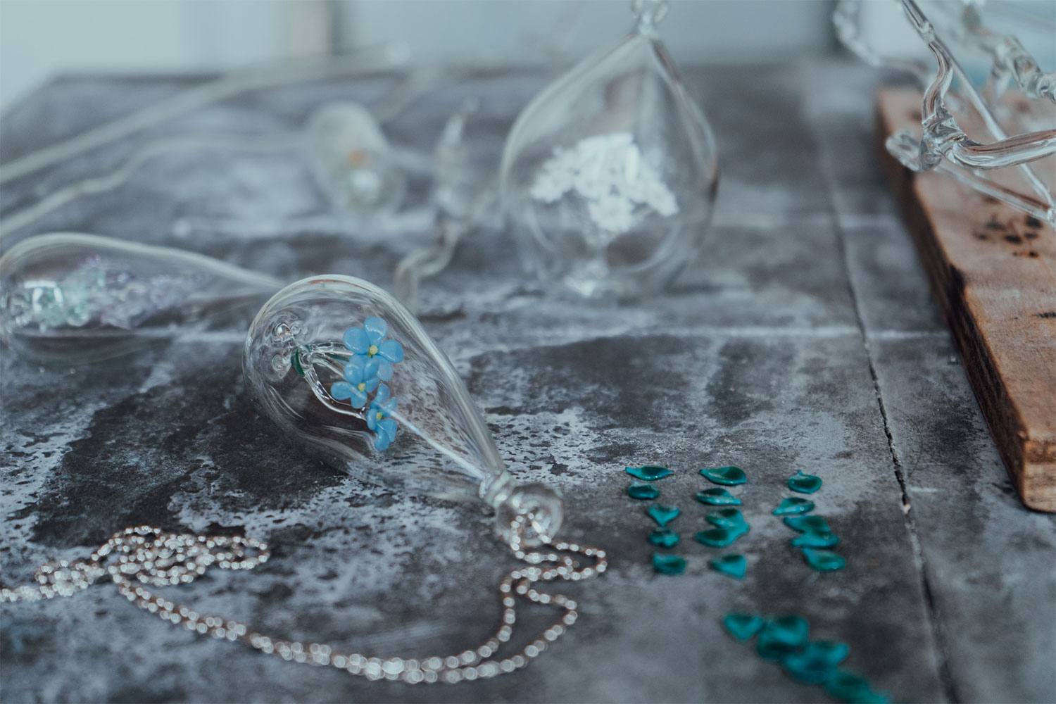 This pendant is part of a collection entitled Ethnobotany, which is inspired by Emma's research into the relationship between people and botany and the traditional uses of plants to heal individual organs. Emma made the pendant using the lampworking technique. By melting, flattening and pulling borosilicate glass on the torch, individual sections were created and then assembled when hot into a whole piece. The transparency of clear glass has been intentionally maintained to heighten the organic ecosystem within, while adding a little colour to some petals made each one unique.