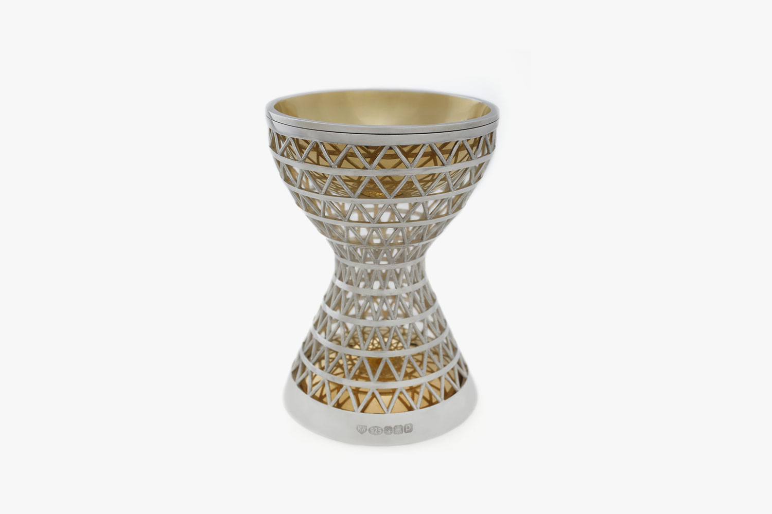 A gilt cup fashioned from recycled sterling silver was set in the top of this miniature goblet with a lattice design. Karen is inspired by the “tools” used to explore outer space, and how they explore the invisible. The underlying subjects of her work are our relationship with the universe, time and our existence.