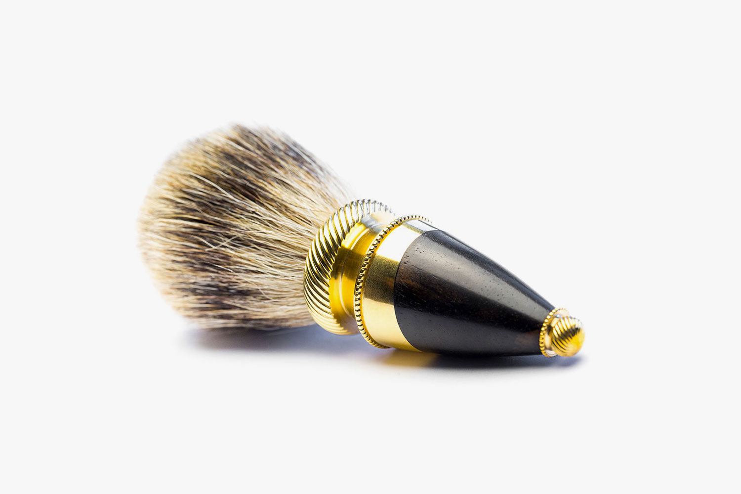 This elegant shaving brush has a handle of ebony and hand-knurled brass. With bristles of badger hair, it is the ideal tool for a traditional wet shave.