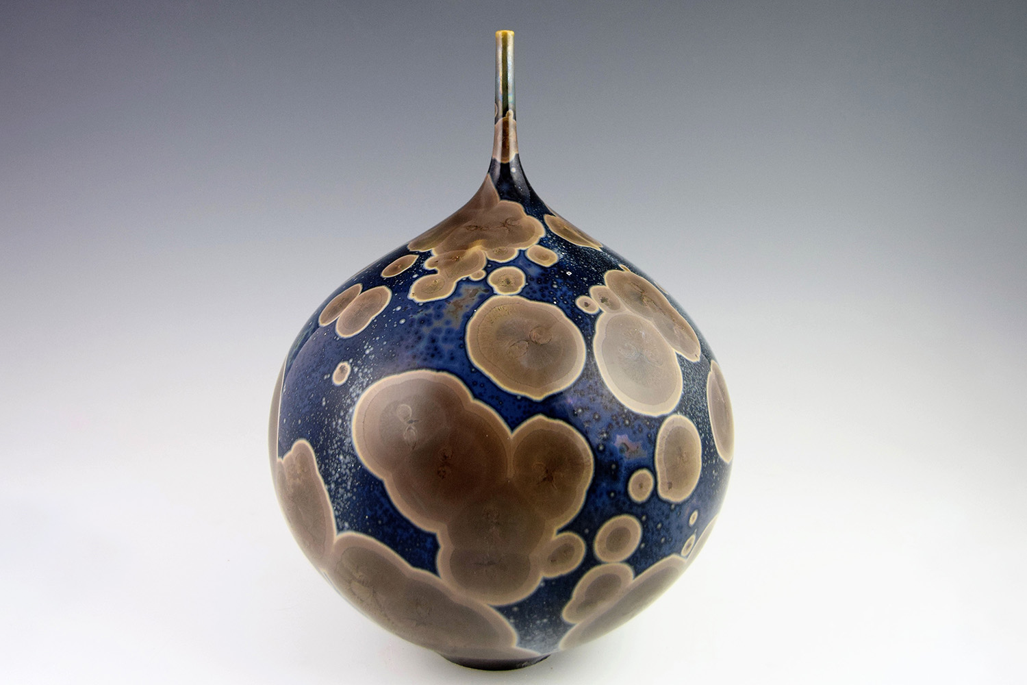 This piece is a hand-turned vessel or bottle decorated with crystallisations.