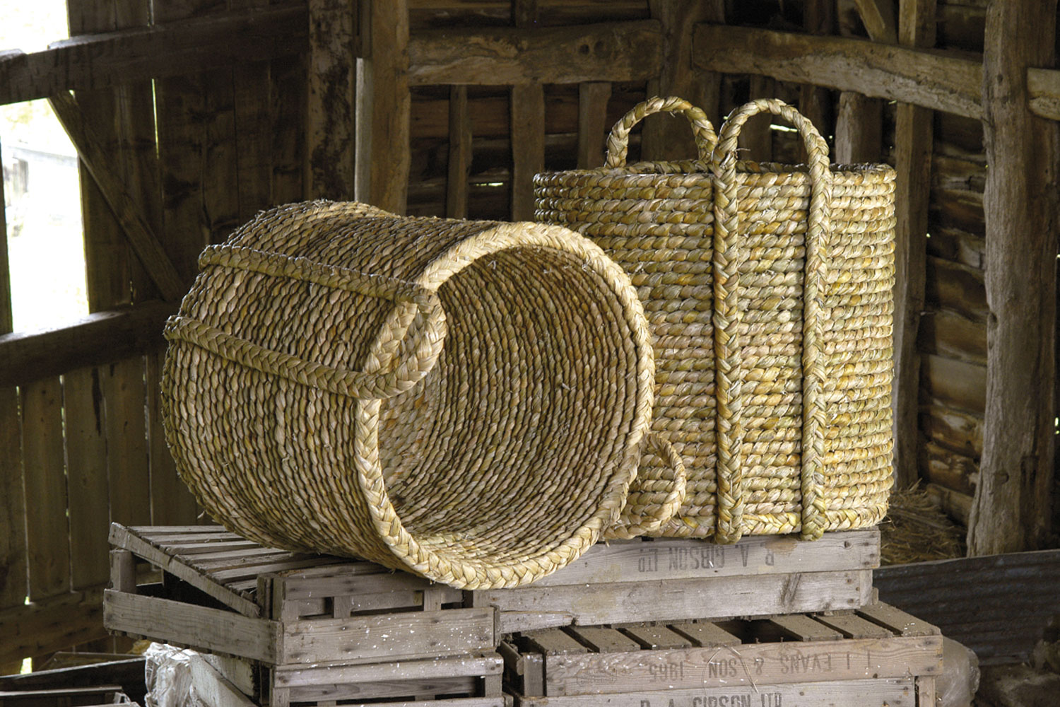 Over 100 metres of English bulrush were used to create these large log baskets. The plait needs to be entirely dry before being hand sewn round a former or mould. The log baskets can be made in many shapes and sizes and should easily last for up to 50 years.