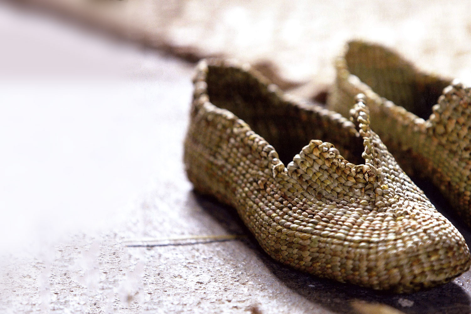 These handwoven slippers were made to measure from English bulrush. Felicity was inspired to make them when she found a similar pair of shoes while exploring France. This is the first pair she made.
