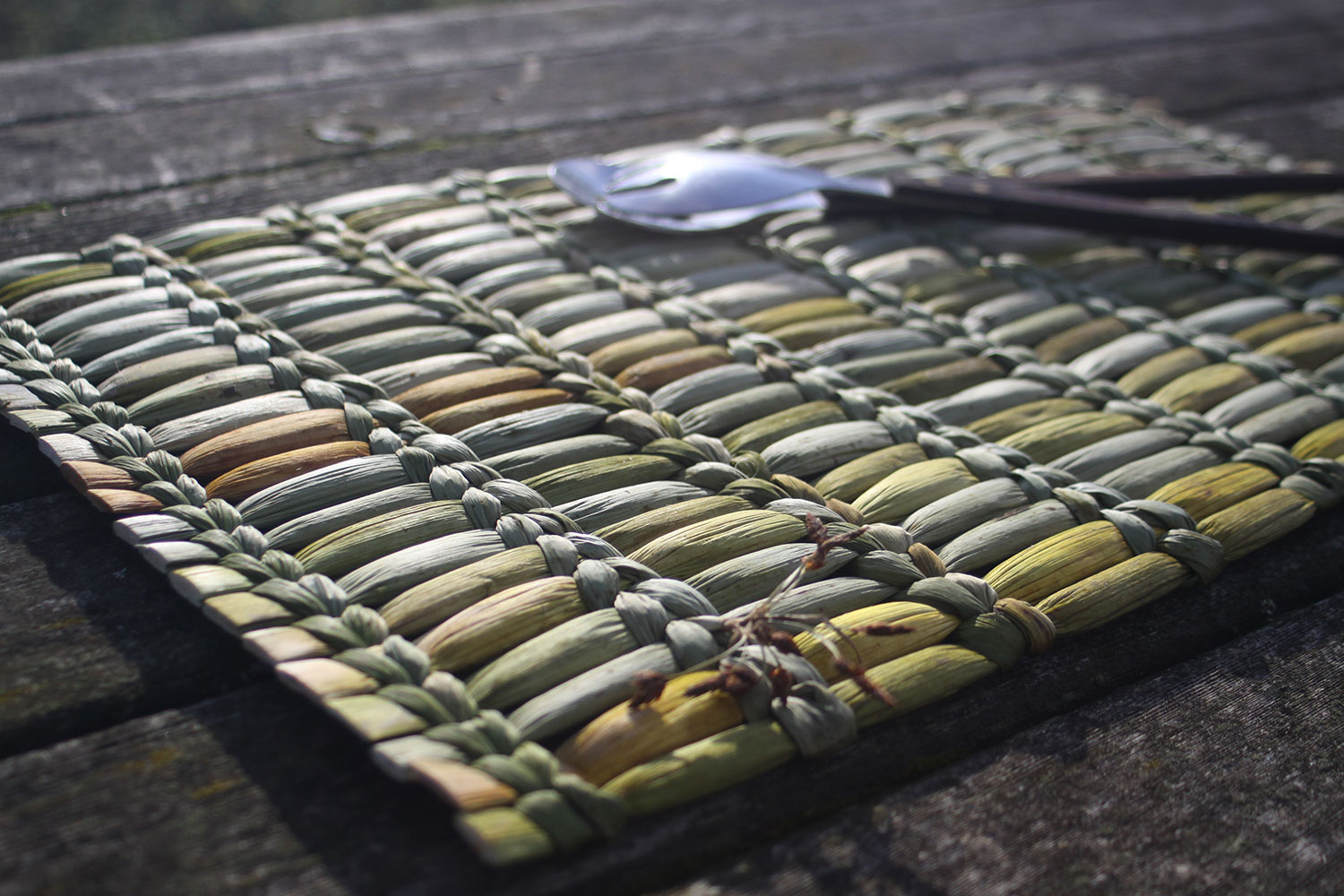 This table runner is made from English bulrush using a chain-pairing weave. Felicity also uses this versatile and beautiful weave to make blinds and bedheads as well as bags. Last year she made 30 bedheads, 3 metres wide, in this weave for Heckfield Place, a hotel in Hampshire.