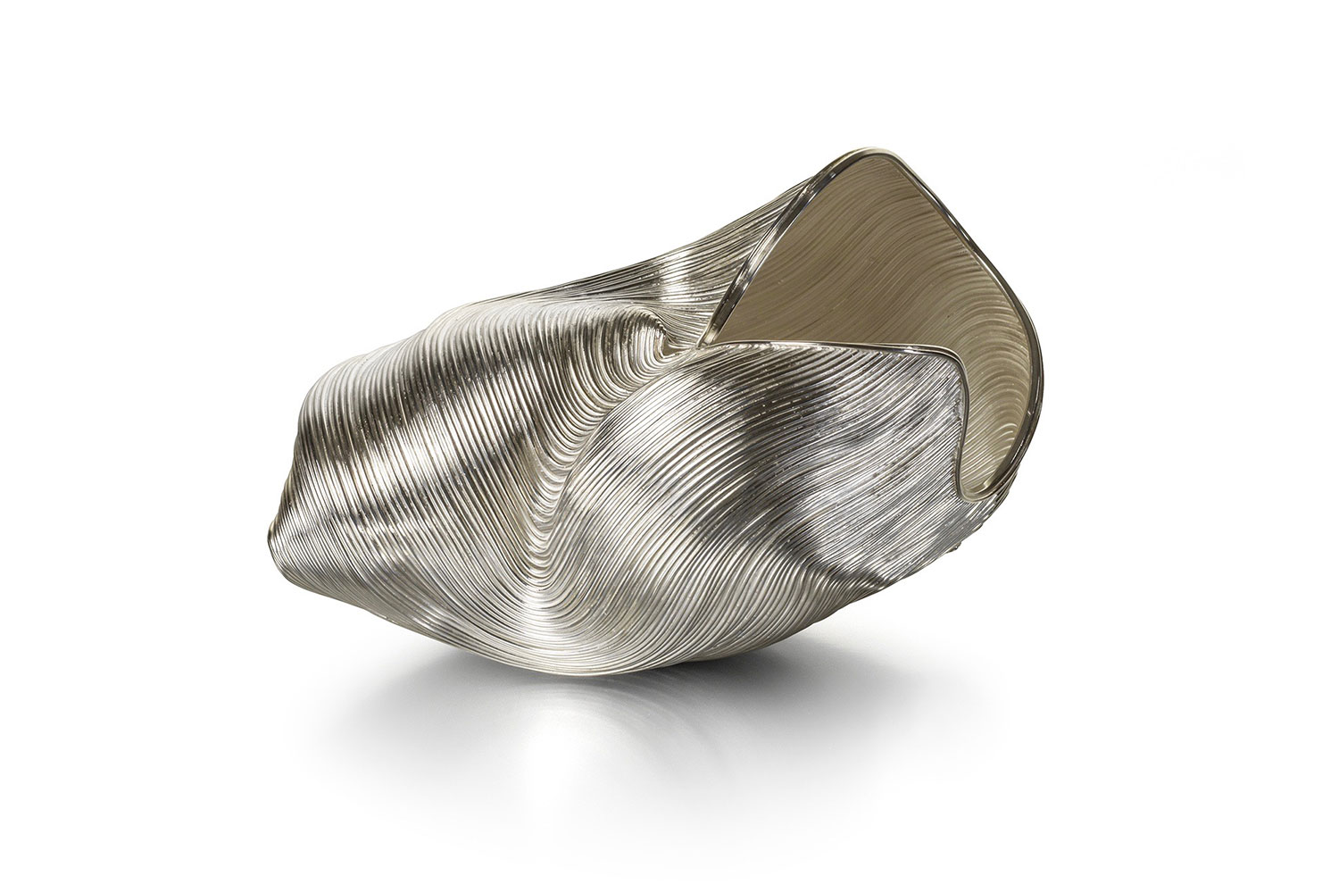 The rings visible on the cross section of a cut tree can reveal its age as well as a story of a specific time in history. Inspired by this natural occurrence, Nan Nan builds up her collection of silver objects by assembling them in ring-like layers. Silver wires were shaped and then soldered together to give this final shell-like form.