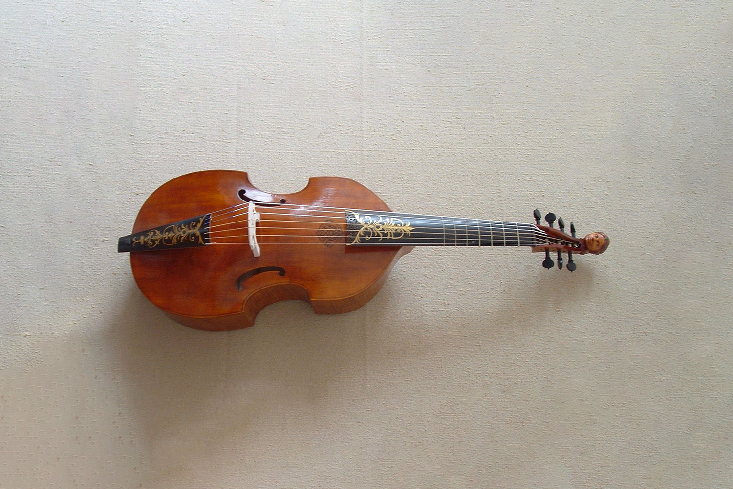 This seven-string viol is based on an original 17th century model by Guillaume Barbey. The scroll of the viol has been carved with a detailed head of a woman, while the fingerboard and tailpiece are painted with gilt monograms in a design borrowed from an anonymous 17th century viol. Through constant study and exploration of medieval instruments and the needs of contemporary musicians, Judith works to refine the connection between them.