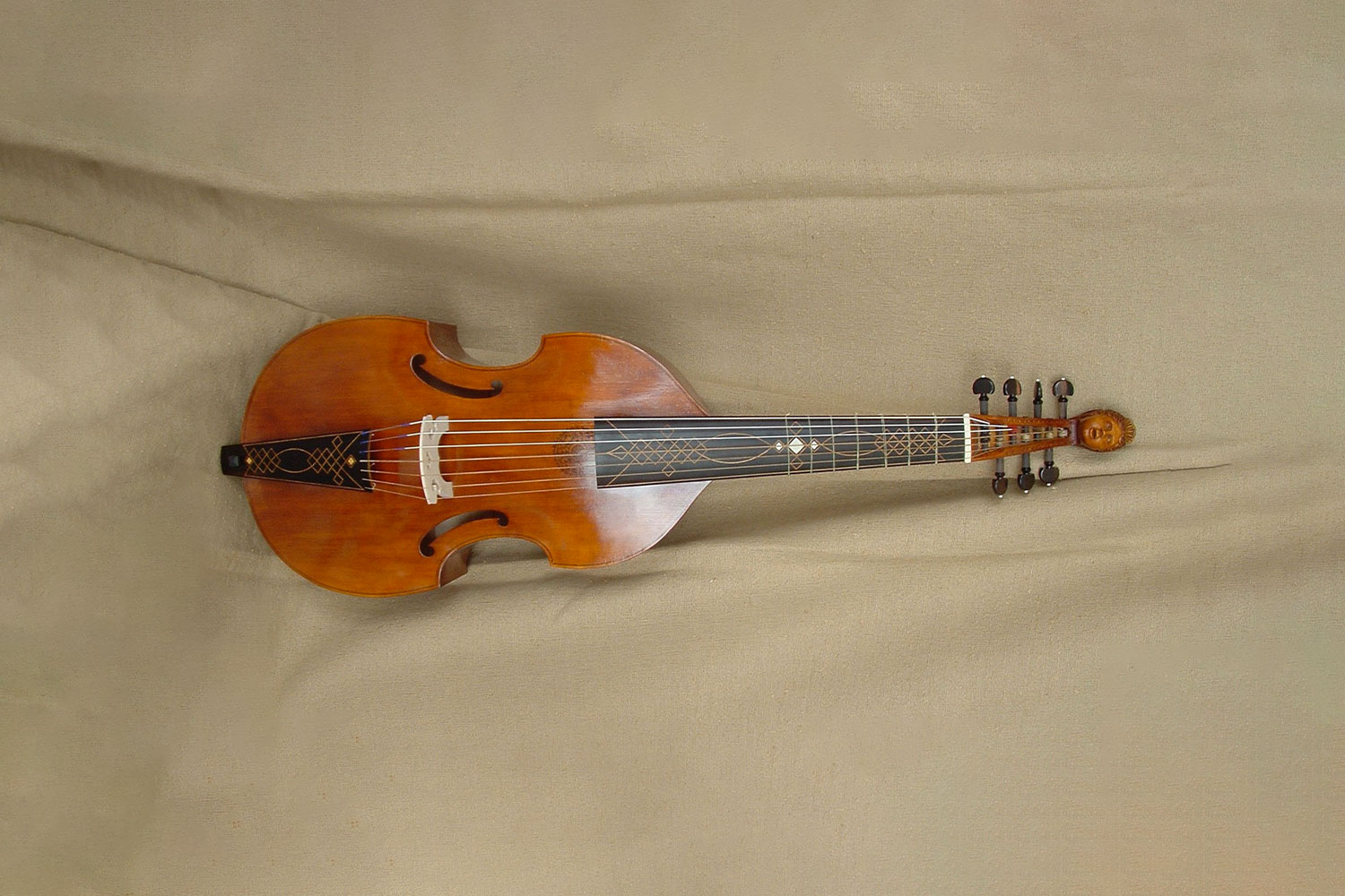 This seven-string French bass viol is based on an original 17th century model by Michel Colichon, who was probably the first French luthier to add a 7th string, which helped give the French viol its characteristic resonance and influenced the music of that period. The scroll of this viol has been carved with a detailed head of a woman, while the fingerboard and tailpiece are decorated with inlaid ivory. Through constant study and exploration of medieval instruments and the needs of contemporary musicians, Judith works to refine the connection between them.