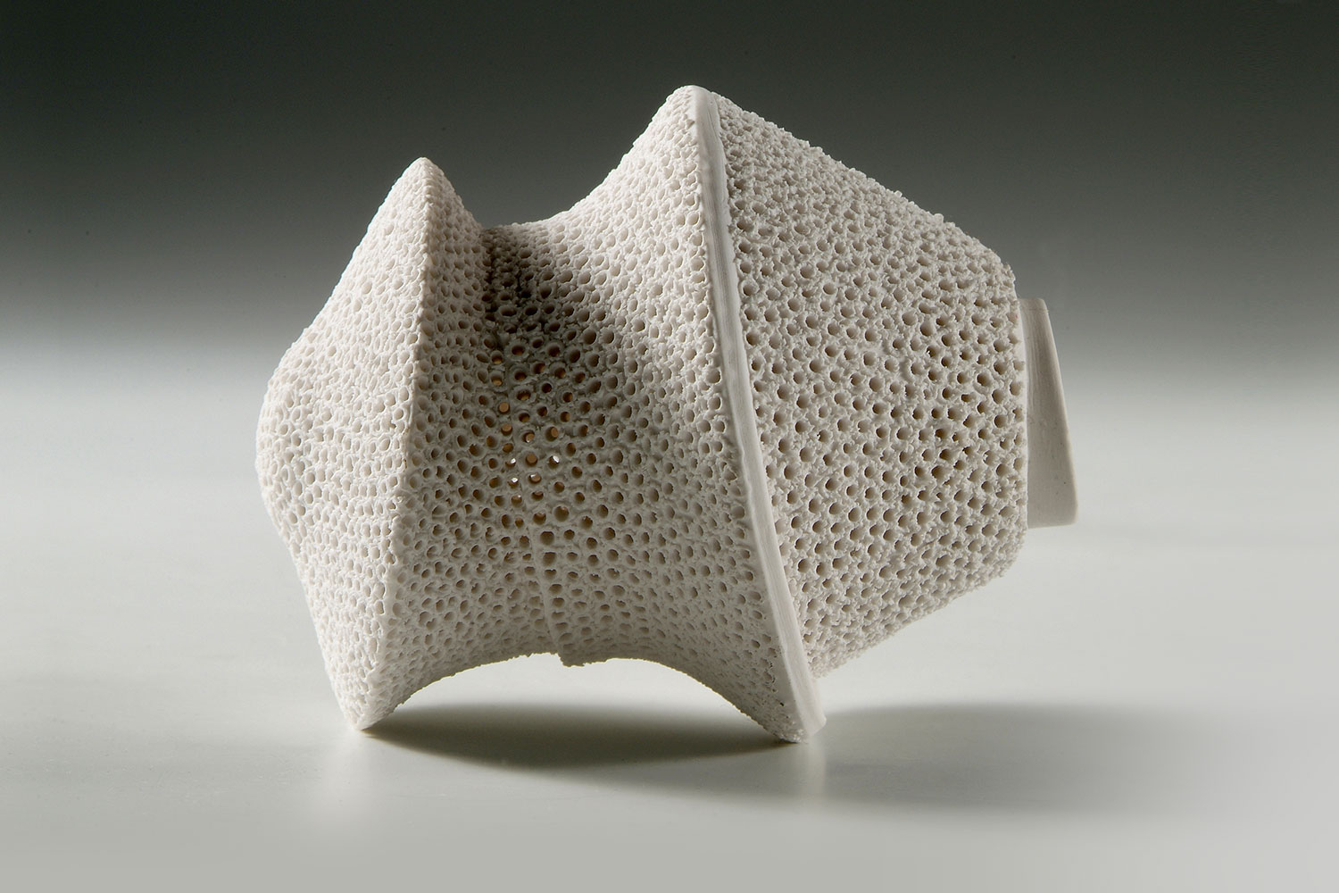 Because Reinhilde enjoys the interaction between his pieces and their viewers, he created this design that moves when someone approaches it. The clay sections that make up the piece are not parallel. The base is wider than the top to ensure that it can be rocked slightly but will not roll over. When placed on a wooden floor, kinetic energy can move it, startling passers-by.