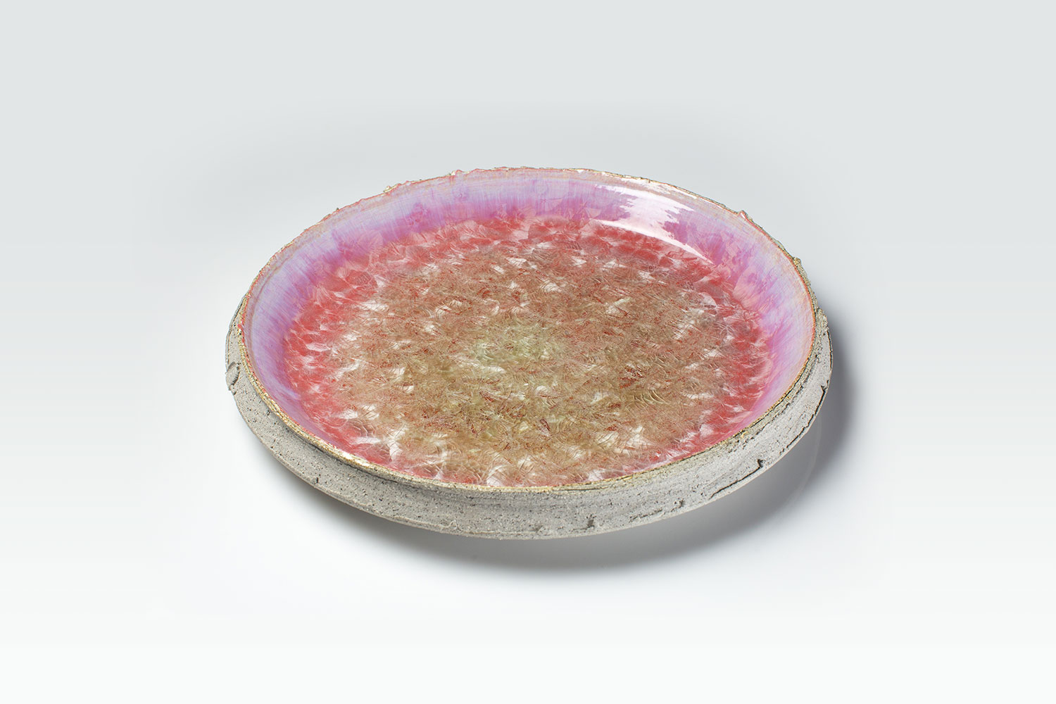 Using a roughly chamotted (or grogged) porcelain that he produced himself, Ricus added a pink and sand-coloured crystal glaze, also of his own production, to decorate the surface of the plate. The more one looks at the glow of the crystal glaze, the more the different stages of production become apparent.