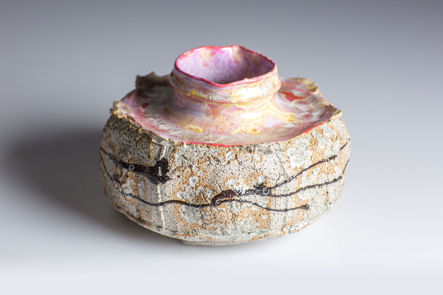 This vessel was crafted from a coarse-grained porcelain and a glaze produced by Ricus. The glaze expands during the controlled cooling of the ceramic in the kiln, producing a crystal-like glow. It appeals to Ricus that the more one looks at the piece, the more the different stages of production become apparent.