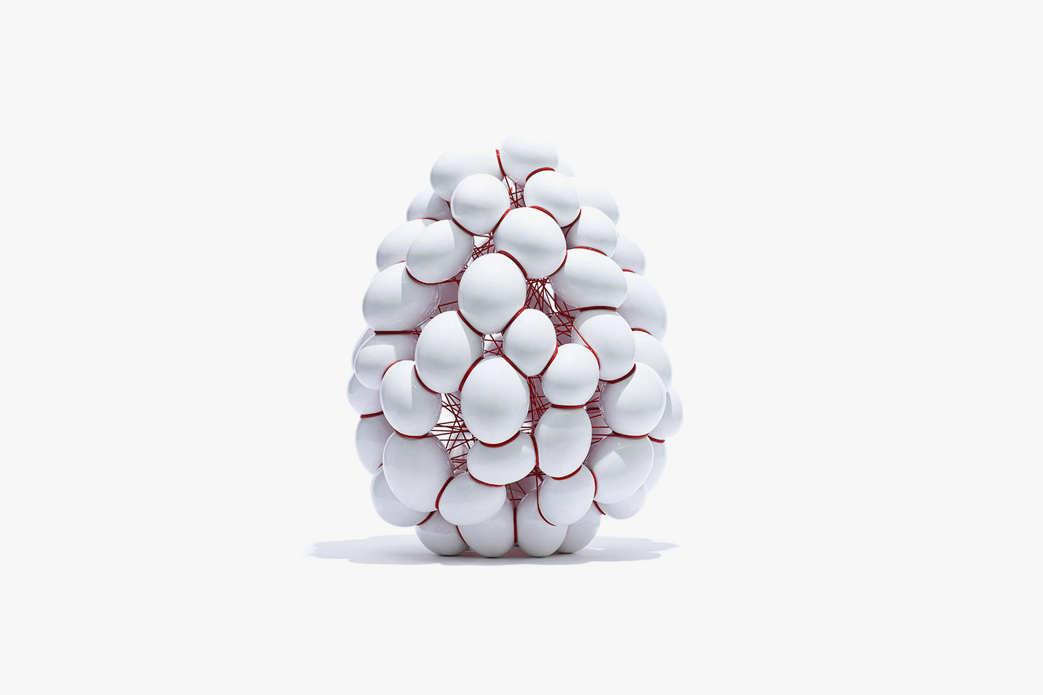 Narrow strips of red PVC bind together the white glazed earthenware shapes to form this spatial sculpture. Steen's ceramic creations are innately decorative. Though he often incorporates materials such as PVC, handcrafted glazed clay forms the core of his works and philosophy.