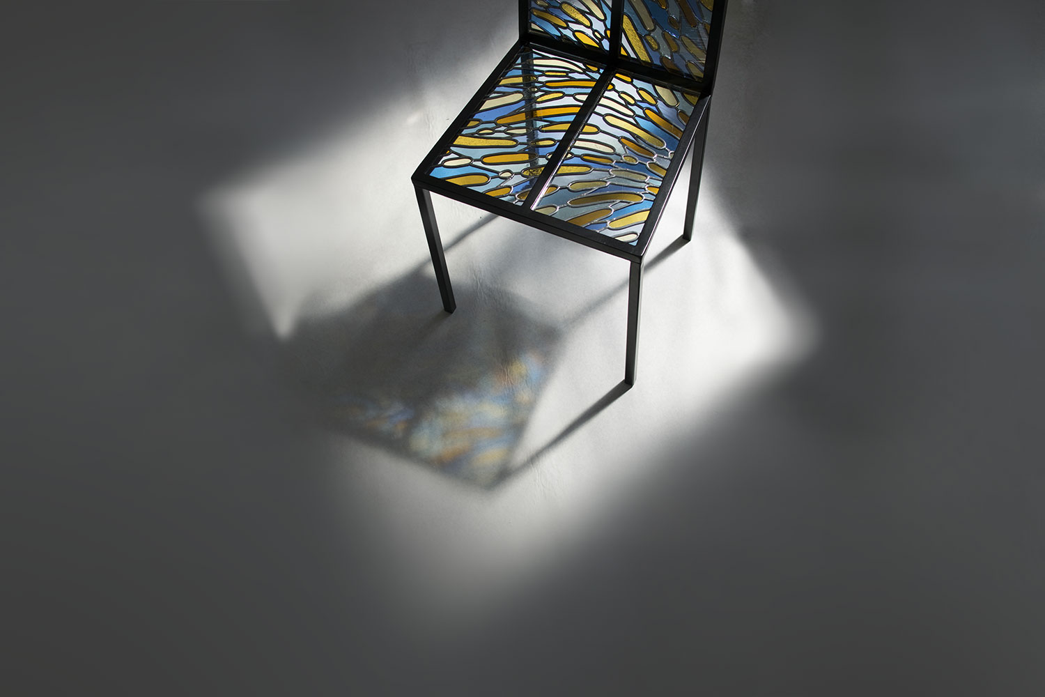 A stained-glass window has been removed from its traditional architectural context and reinterpreted as furniture. The addition of four feet and a backrest transforms the window into a translucent chair, providing a contemporary perspective on an old-fashioned craft.