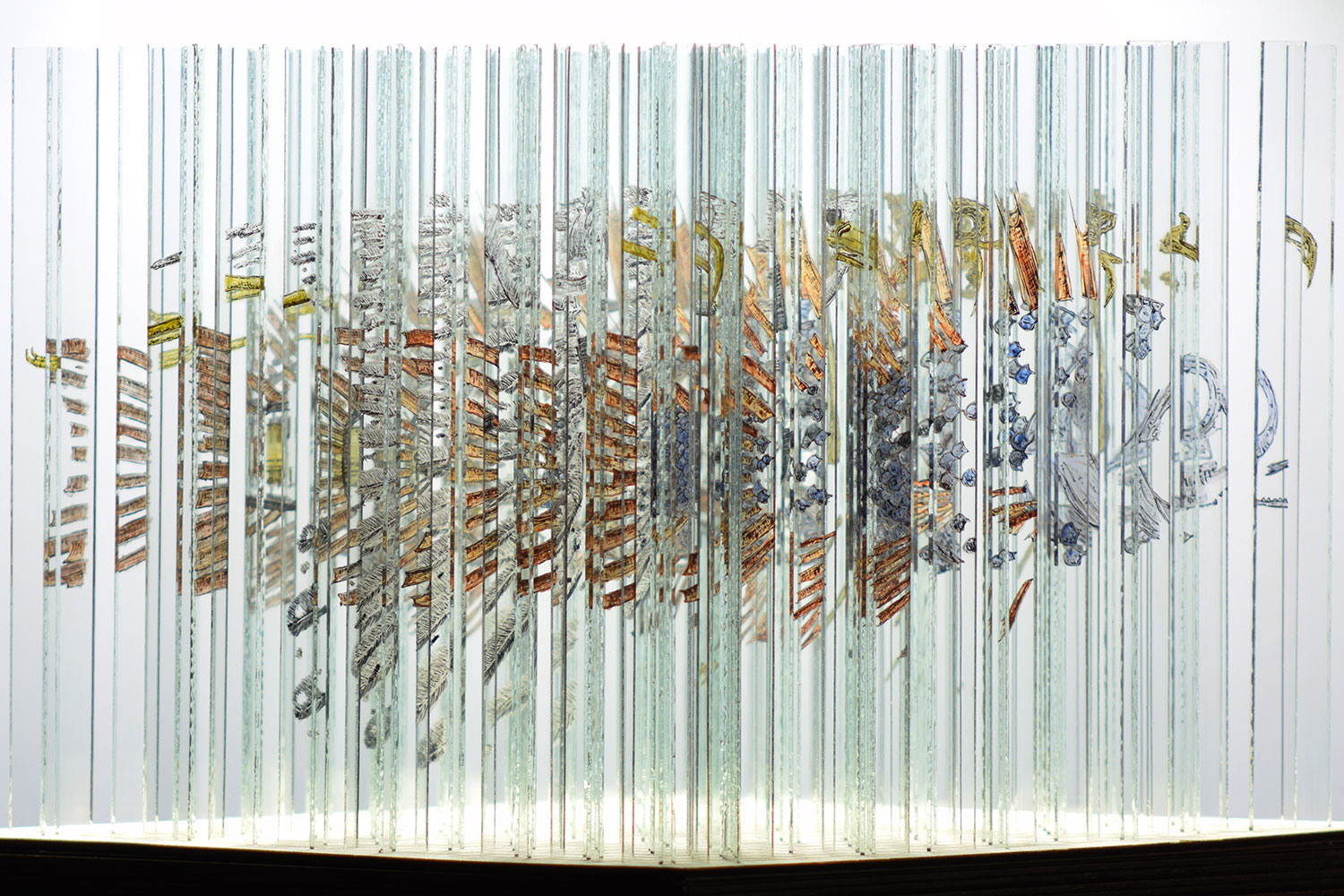 The “Emulsifier” is a hand-painted anamorphic sculpture comprising 160 glass strips. When the sculpture is rotated, a different image appears at every 90° angle. The glass strips are set into laser-cut slits in a wooden base. The images were painted on to the glass with the same colours used to colour traditional stained-glass windows.