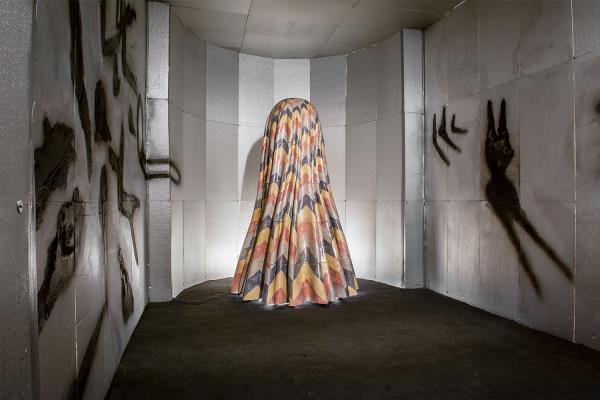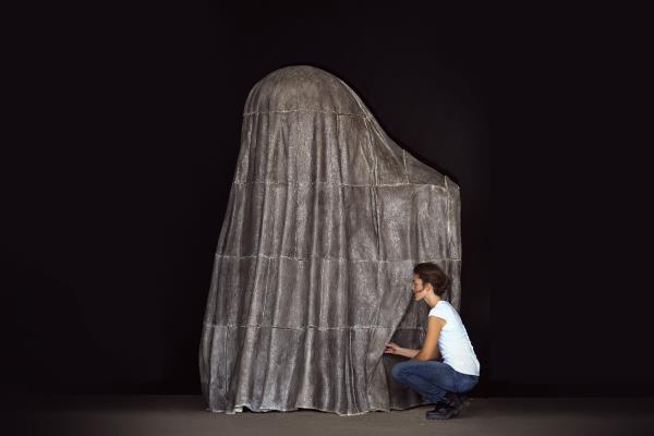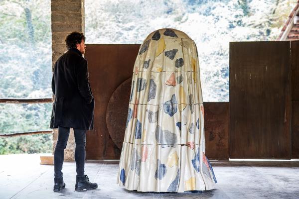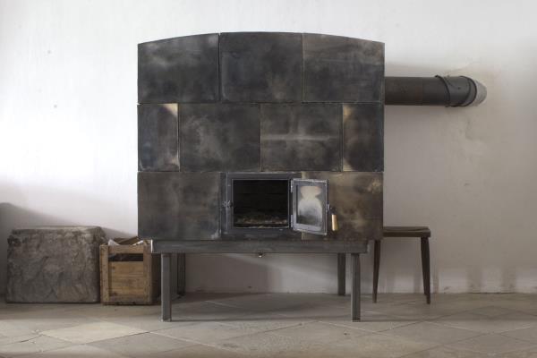 This large, pink-hued ceramic stove brings warmth to a room, both physically and aesthetically. The tiles have been designed to create the illusion of cloth covering a hidden treasure. This mediator of mystery reflects the hearth as a place swathed in myths and legends. The stove embodies the fascination with fire that has existed throughout history.