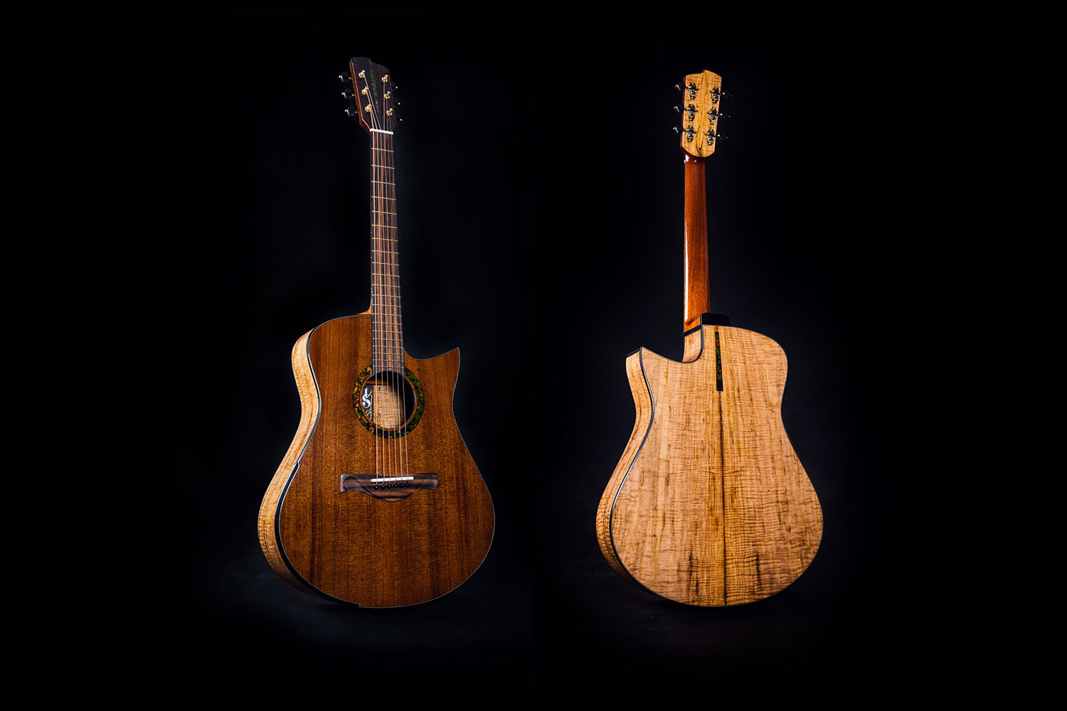 This guitar is an example of a completely bespoke instrument made to a client's specific requirements. Tom's brief for this piece was “earth tones”. The guitar is his favourite to date because of the extraordinary natural colours of the materials used, forging a portrait of almost painterly beauty.