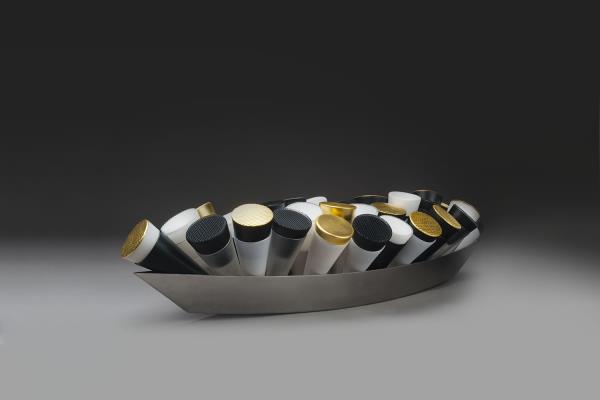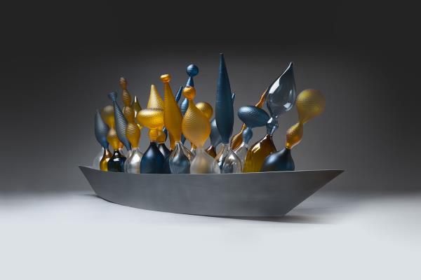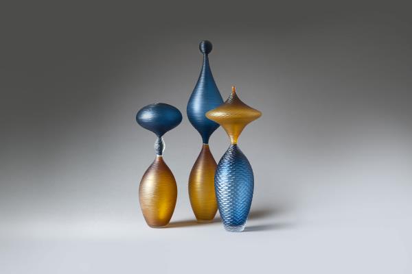 Two tall bicolour hand blown vessels draw on an older history and tradition, while playing with light and distinctly accented lines. They celebrate a rich tradition of glassmaking by using the Venetian Incalmo technique together with battuto cutting, a Baldwin & Guggisberg signature.