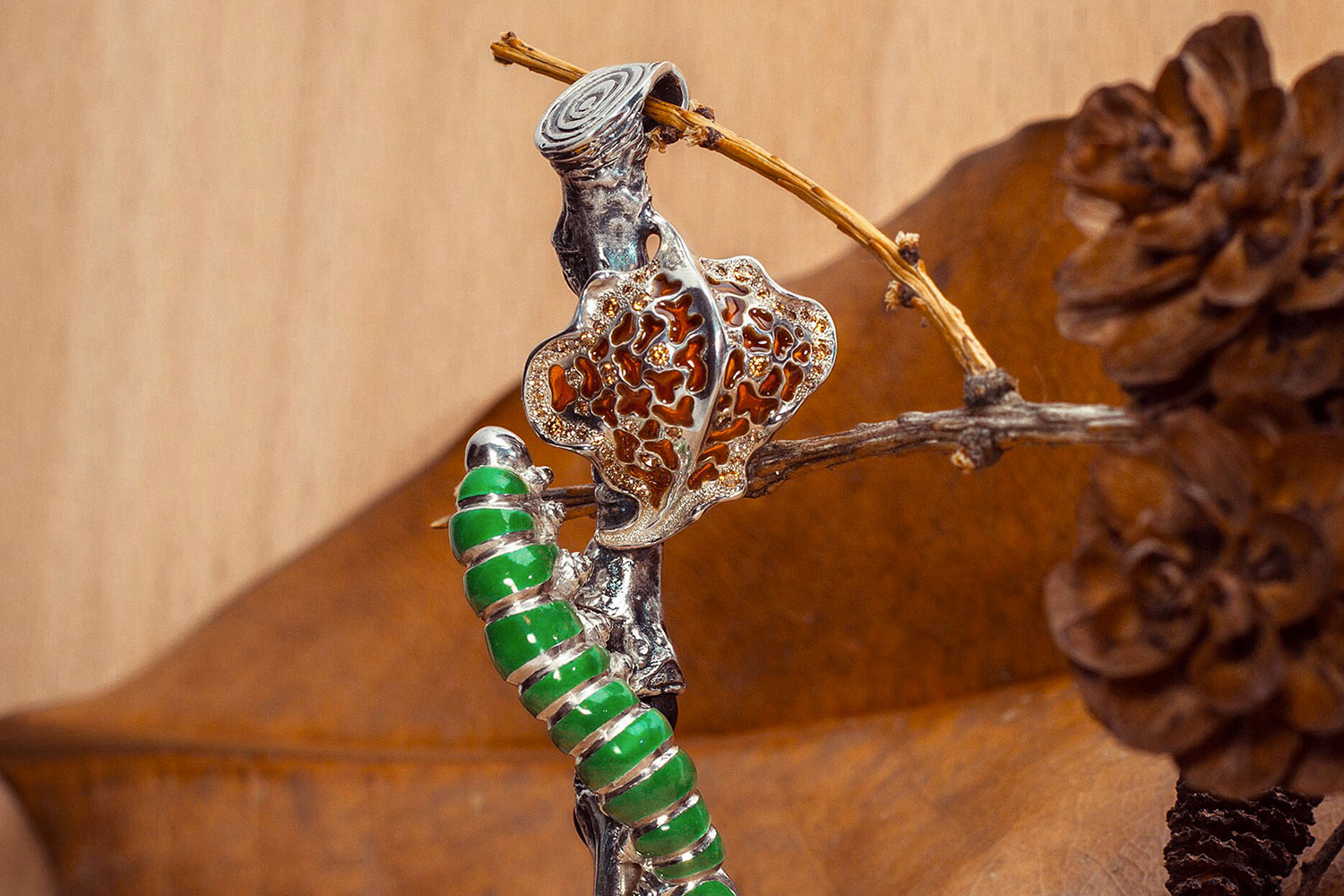 This pendant with a caterpillar crawling on a branch was made from silver, blackwood gems and finished with enamel. A falling autumn leaf contrasts with the bright green colour of the caterpillar.