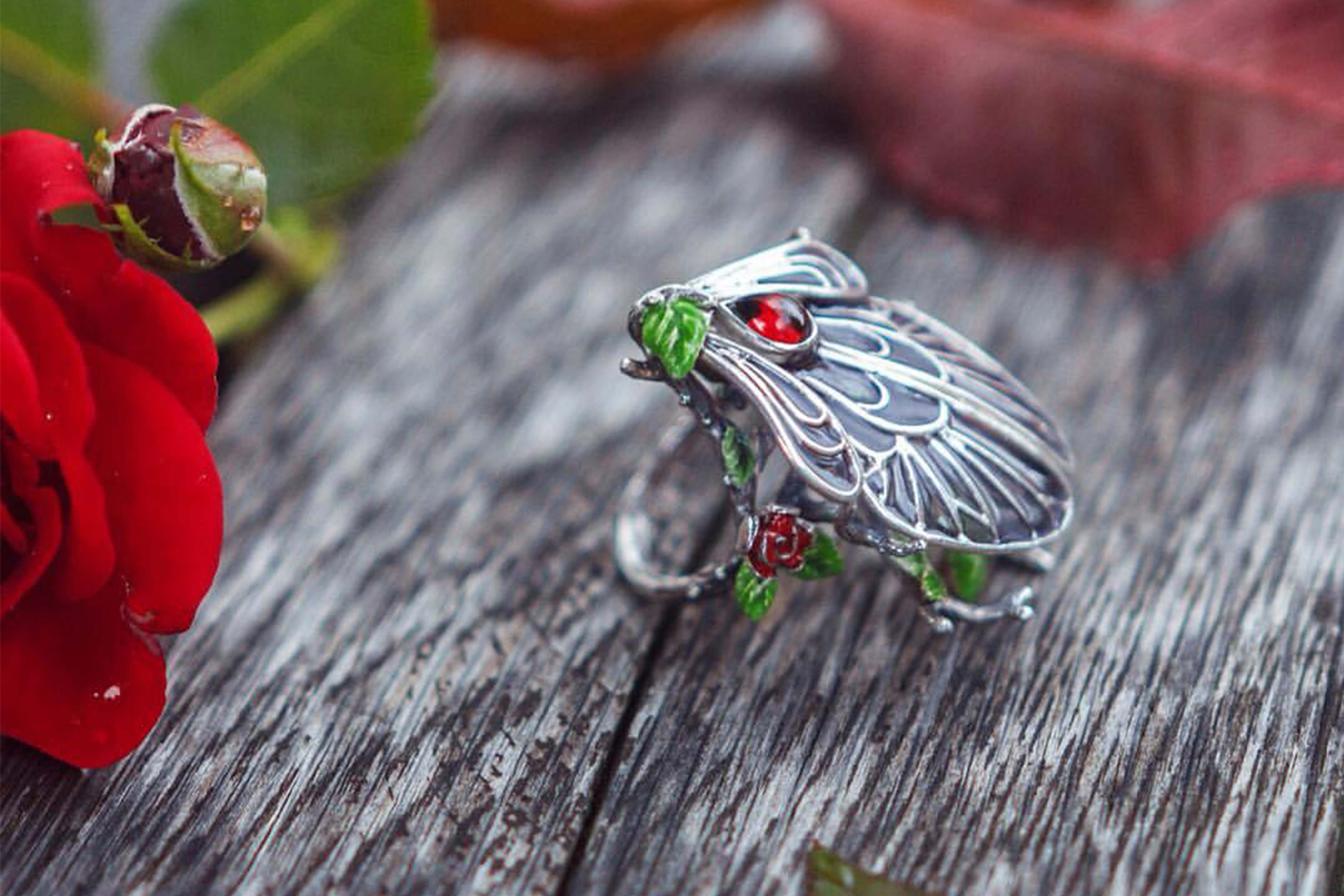 Sergei loves English gardens and manor houses. This is the most important inspiration when designing his works. The shape of this ring combines a bush of thyme and the wings of a beetle, conveying a Victorian spirit.