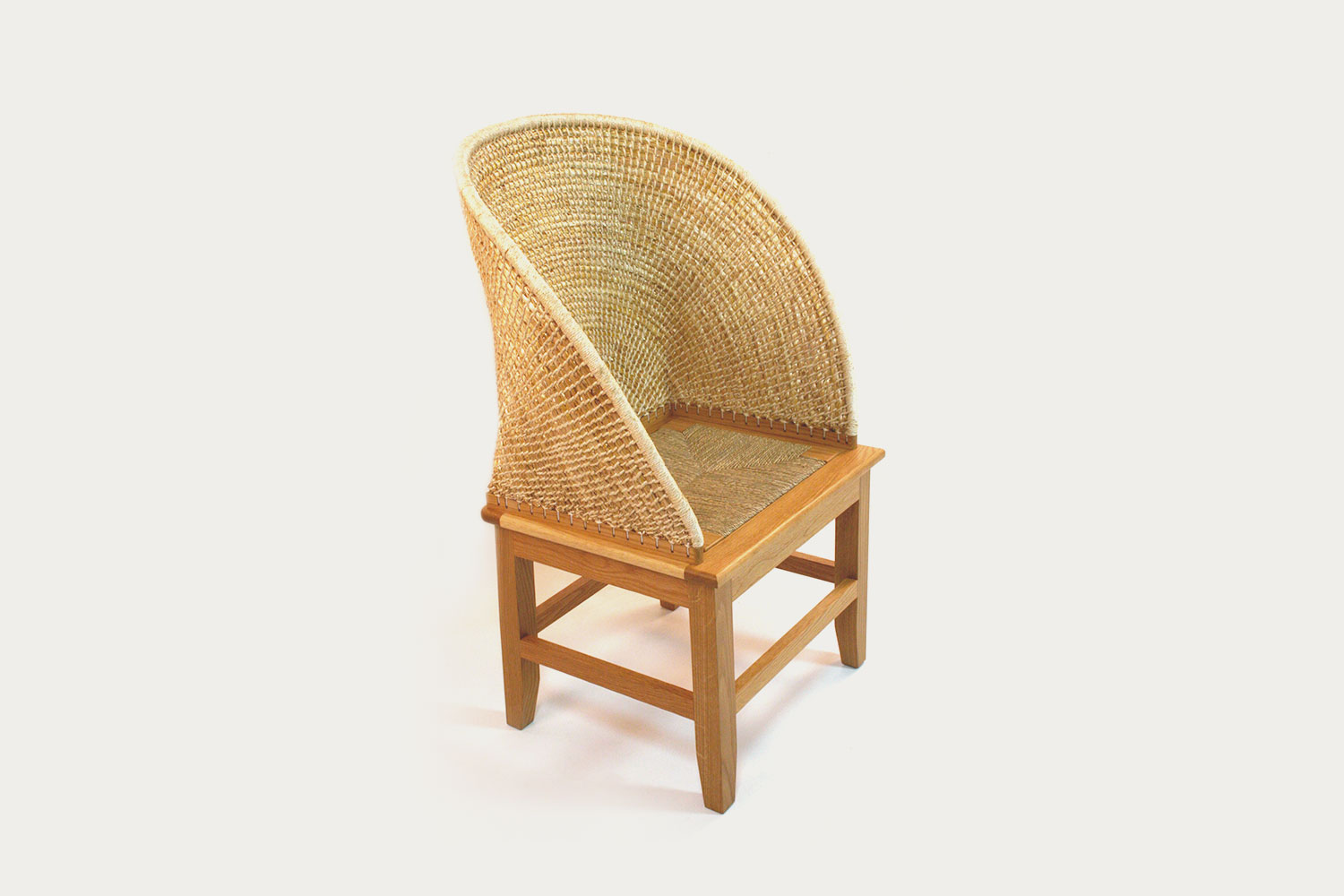 Kevin based the design on one of the earliest Orkney chairs, with a traditional fan back. The seat was handwoven with seagrass and the back handstitched with oat straw. His work combines traditional techniques with contemporary innovative designs. All the materials for the chair were sourced as locally as possible, in accordance with Kevin's environmental philosophy.