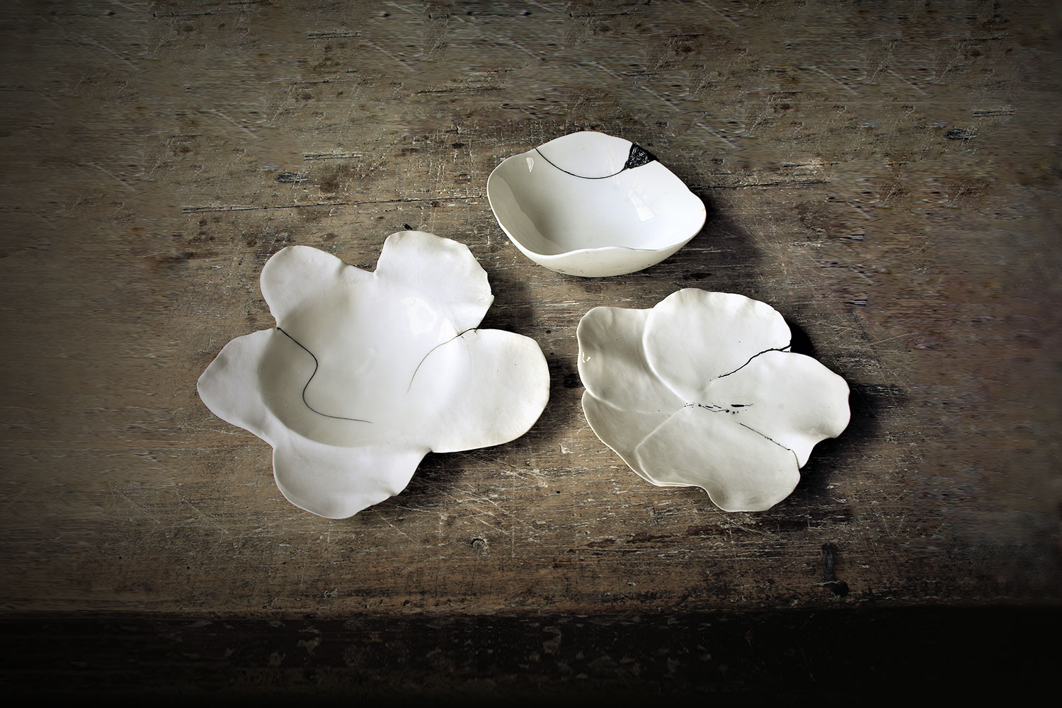 These thin, transparent, bone-china bowls and plates, shaped like blossoms, are part of a series comprising a range of different forms. Roos loves to create series like this, inspired by a particular gift of nature, which, as a source, is endless in its generosity. Each plate or bowl fits into a base plate that remains on the table during the meal. The fissure effects on the plates' surface has been accentuated with black urushi lacquer using the Japanese kintsugi technique.