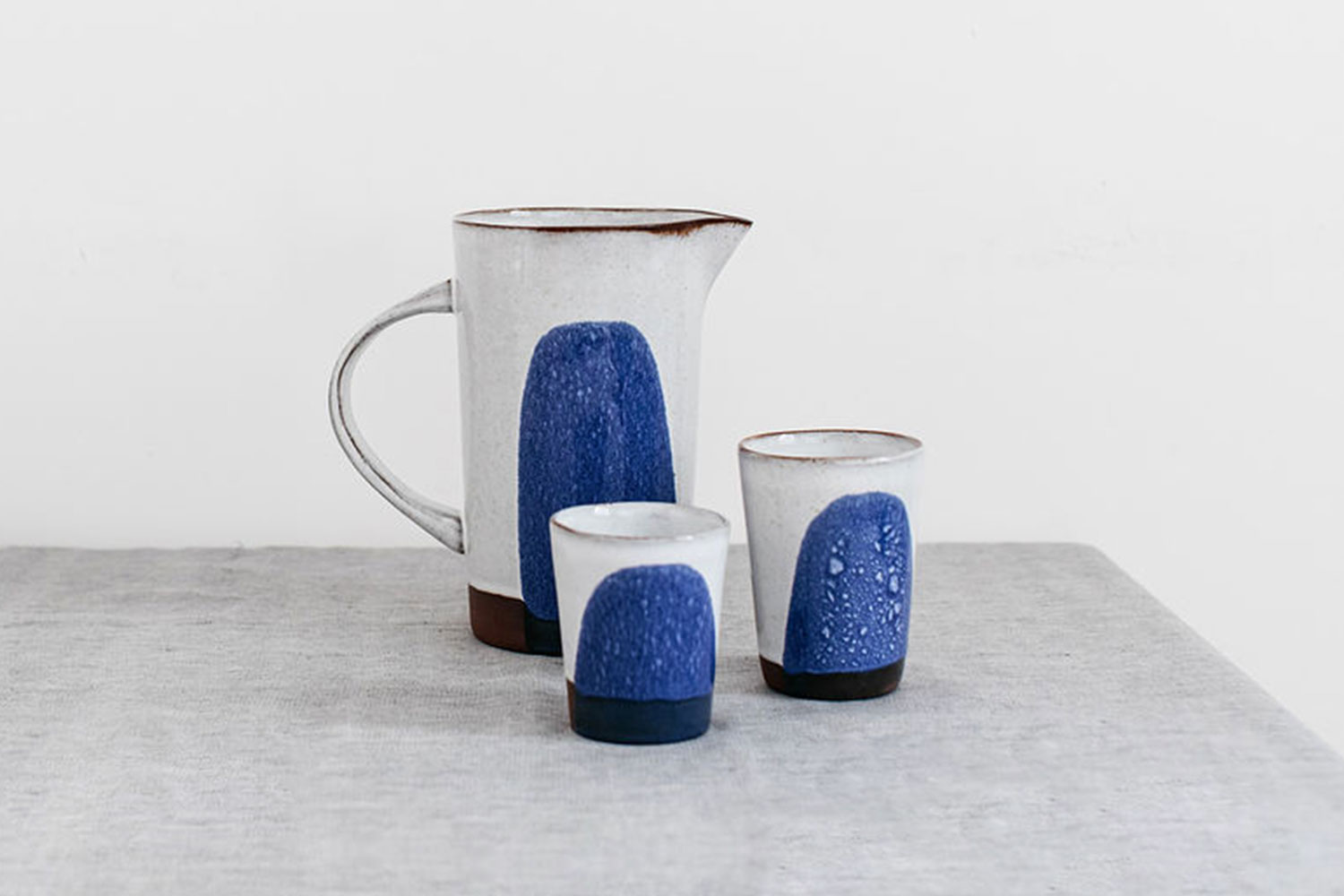 The terracotta pieces that comprise this ensemble have been slip cast and glazed with a light grey tin glaze, with added splashes of cobalt. The bottom is unglazed, polished smooth with a diamond pad and finished with beeswax.