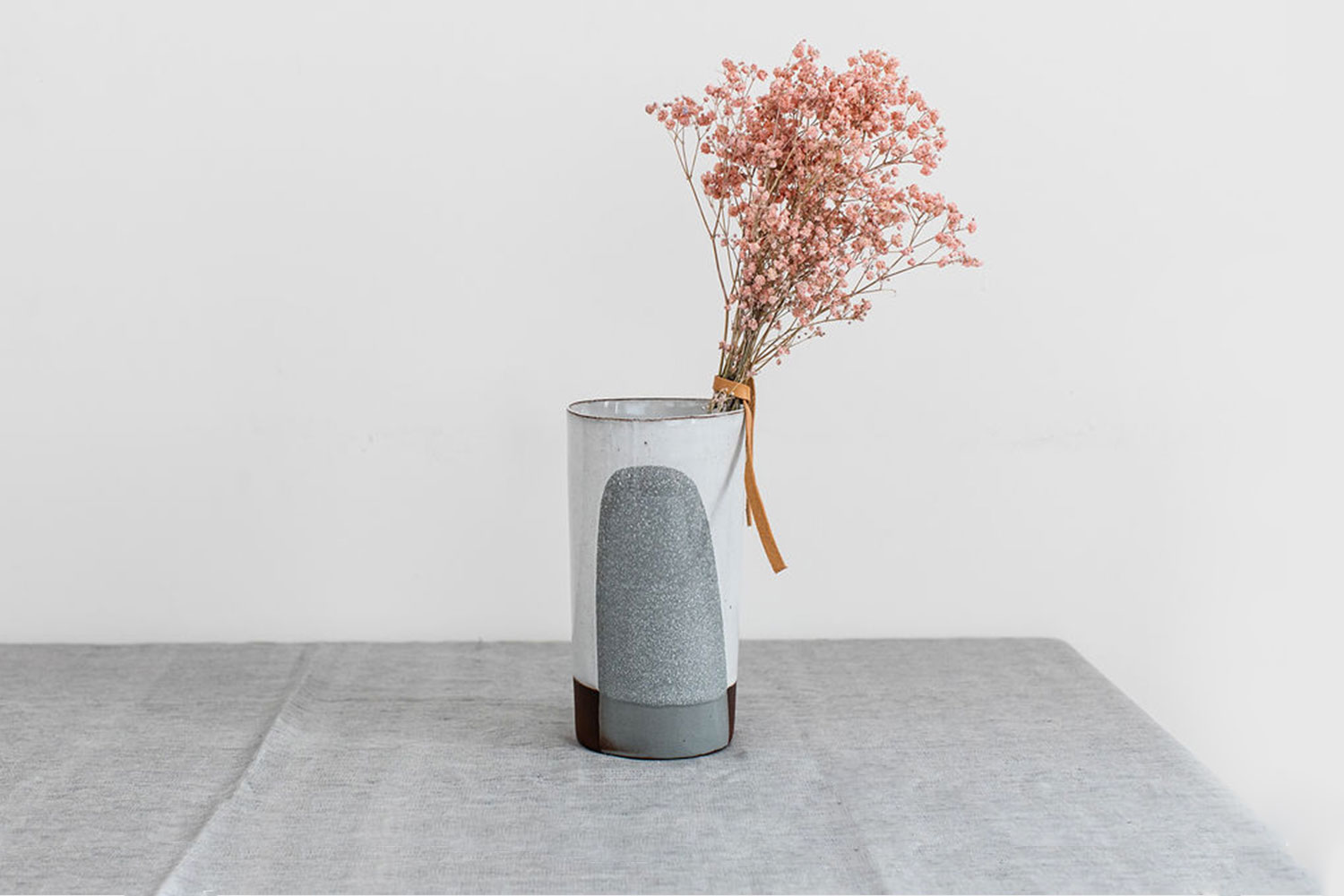 This tall cylindrical vase, slip cast in terracotta, has been glazed with light grey tin glaze complemented by a splash of dark grey. The bottom is unglazed, polished smooth with a diamond pad and finished with beeswax.