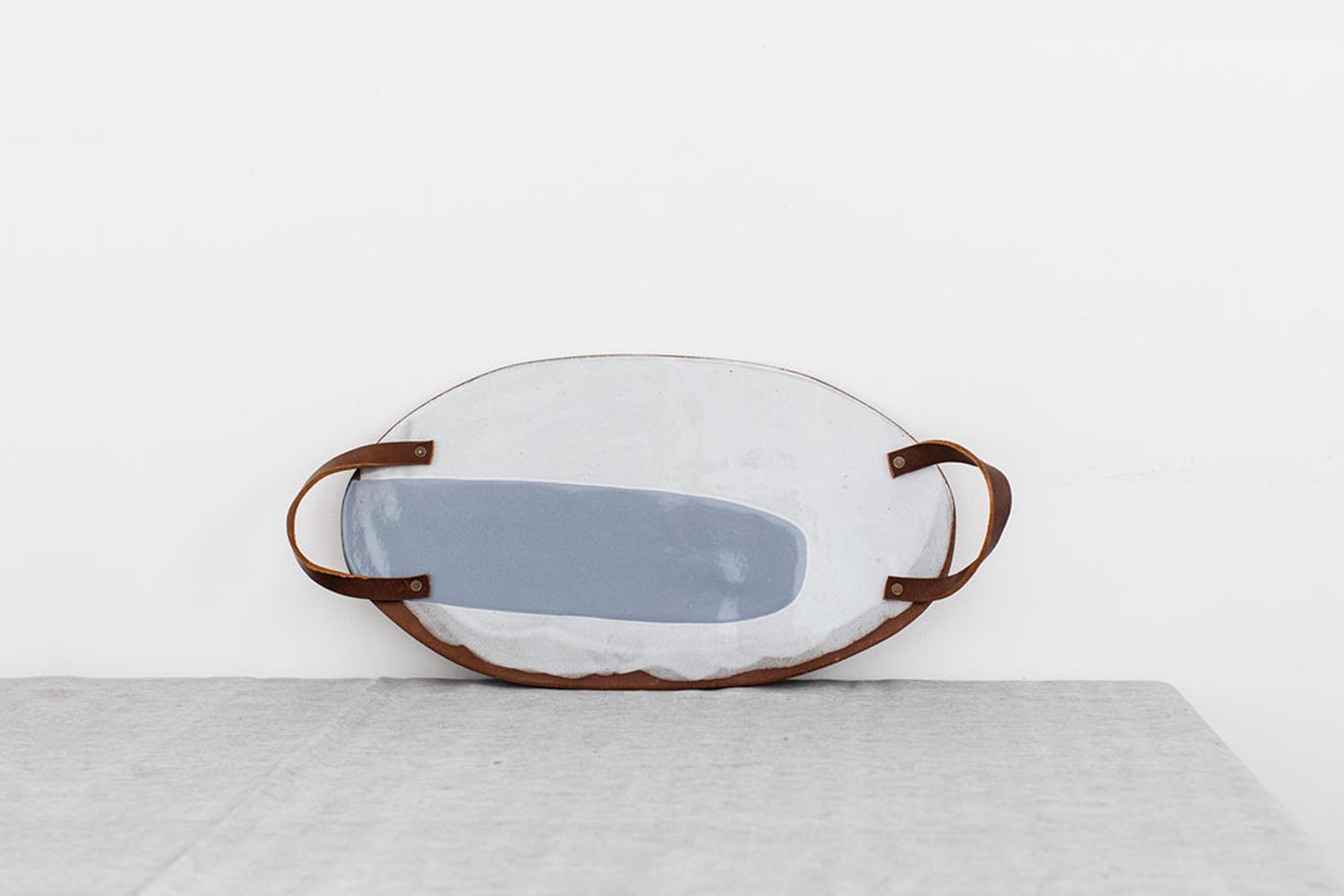 This flat terracotta platter has been hand rolled and glazed with a light grey tin glaze, with an added splash of dark grey. The leather handles are attached with brass rivets. The bottom is unglazed, polished smooth with a diamond pad and finished with beeswax.