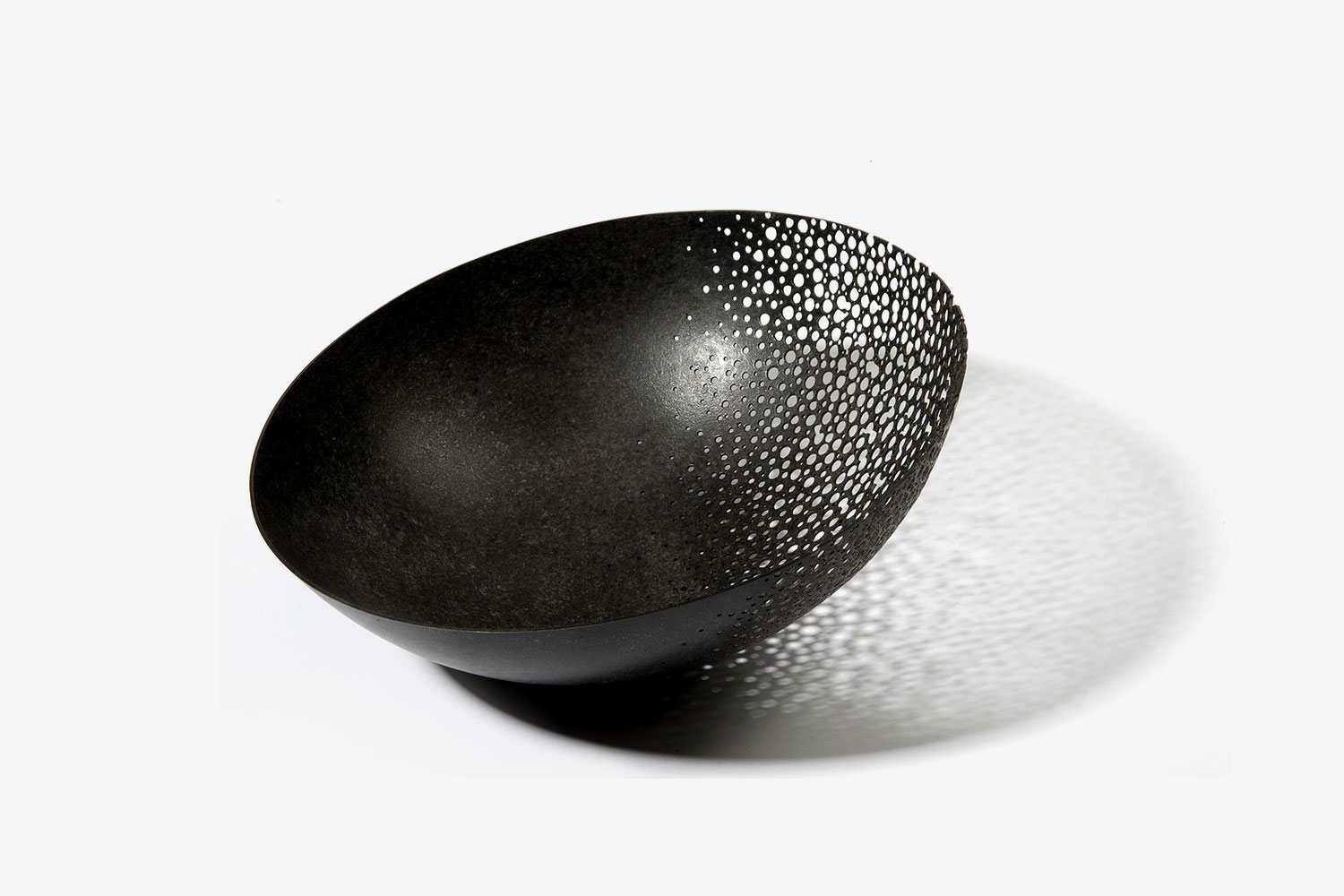 The surface of this open bowl was partly drilled, disrupting the physical and visual balance of the original form, giving it a slight tilt. The patinated surface has a weathered aspect. In her Crumbling series, Ane explores and contrasts solid forms with areas of transparency.