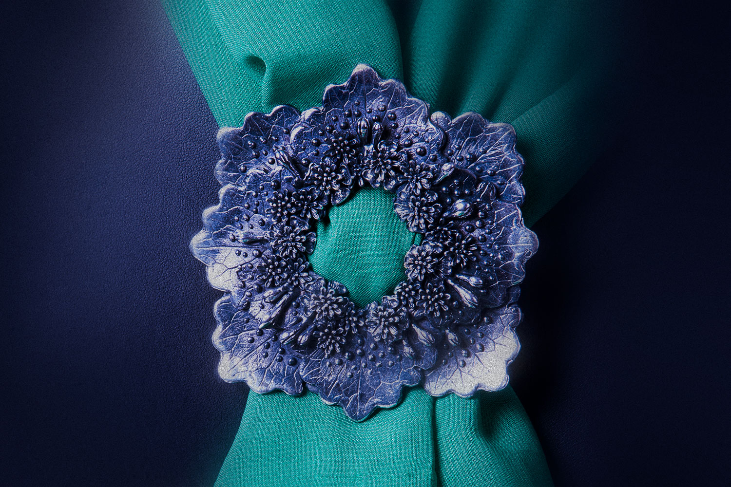 This silver-plated brass ring, ideal for scarves and tippets, is part of Irina Shabut's Summer in St. Petersburg collection. She recommends wearing it with a silk scarf or tippet. The unique ring was hand cast using a wax mould.