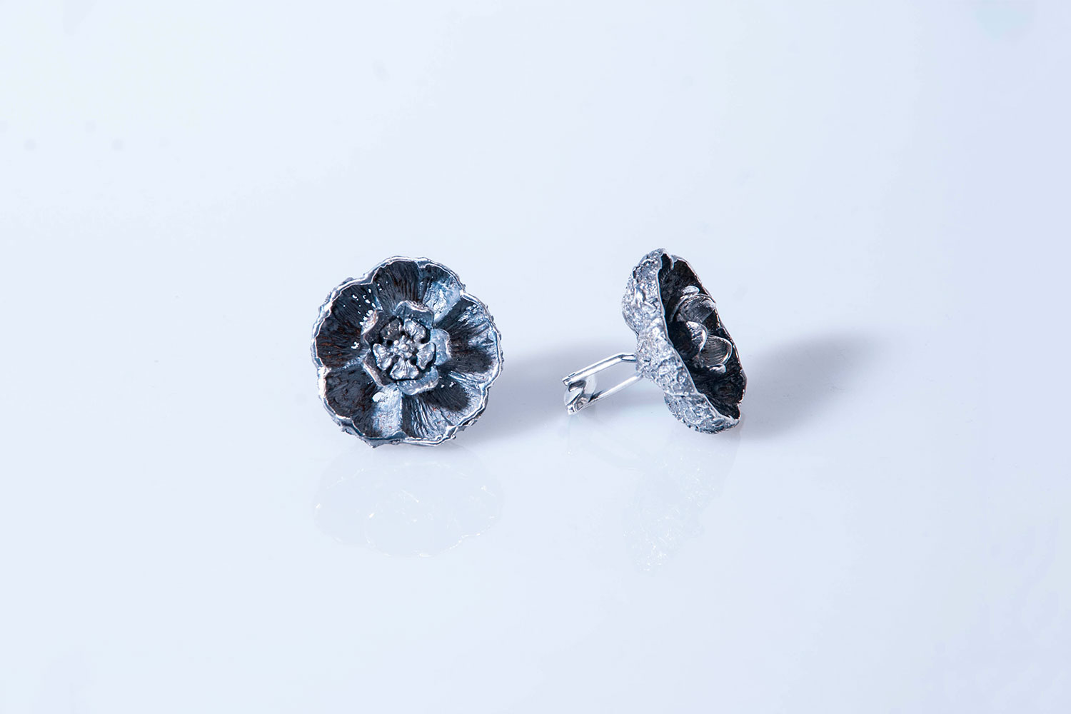 This pair of cufflinks with a floral motif is from a larger collection of women's cufflinks. The collection features cufflinks with different motifs of flora and fauna, decorative architectural elements and other themes. This pair, hand cast using a wax mould, combines elegantly with a shirt as well as with various cuffs and bracelets.