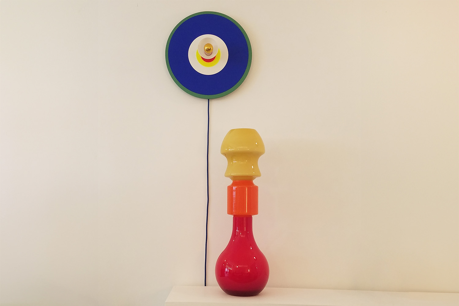 This table lamp is made from red, orange and yellow recycled glass in a geometric shape that gives it a sculptural aspect.