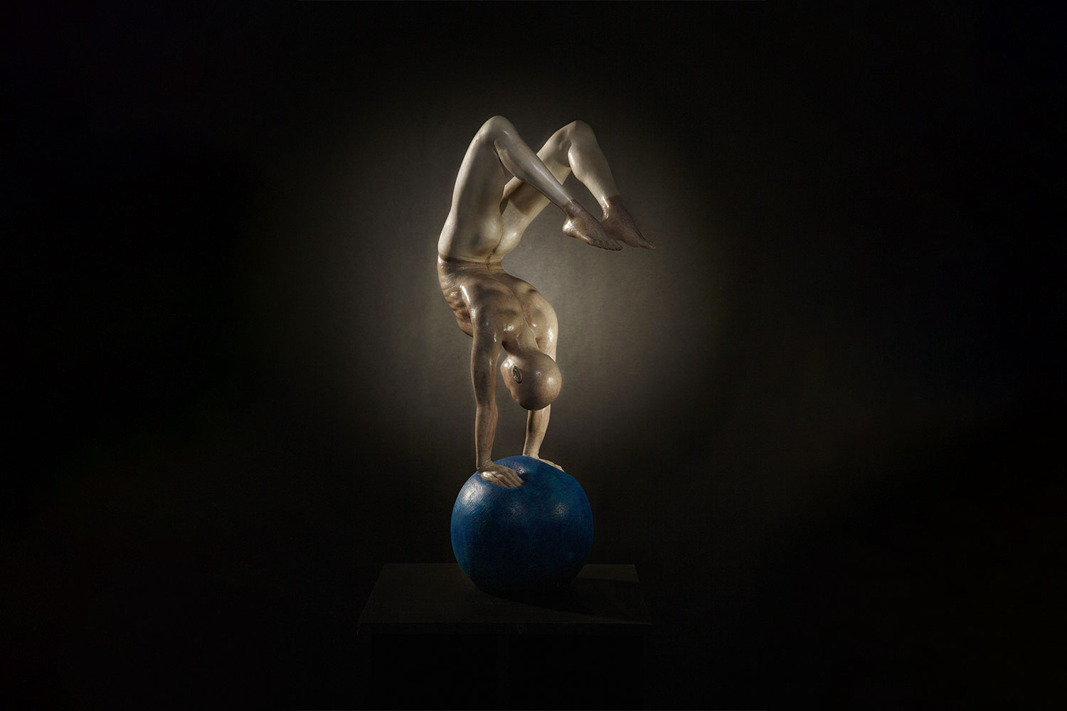 This carving of a contortionist, mounted on a sphere, is characterised by the tension and movement generated by the almost impossible pose, on the verge of collapse. The polychrome wood emphasises the taut muscles of the figure.