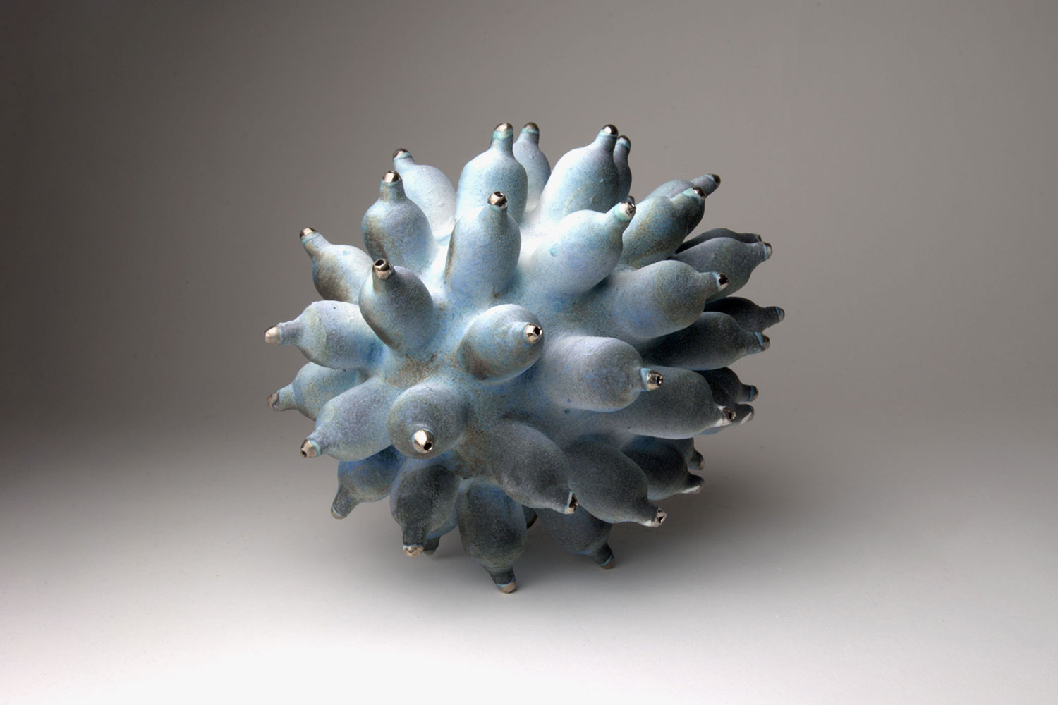 Eva draws her inspiration from many areas, but the common denominators are always nature, science and mathematics. This thrown sculpture, crafted from altered and assembled porcelain with a platinum lustre, is part of an ongoing investigation into form and the complicated nature of the ceramic-making process.