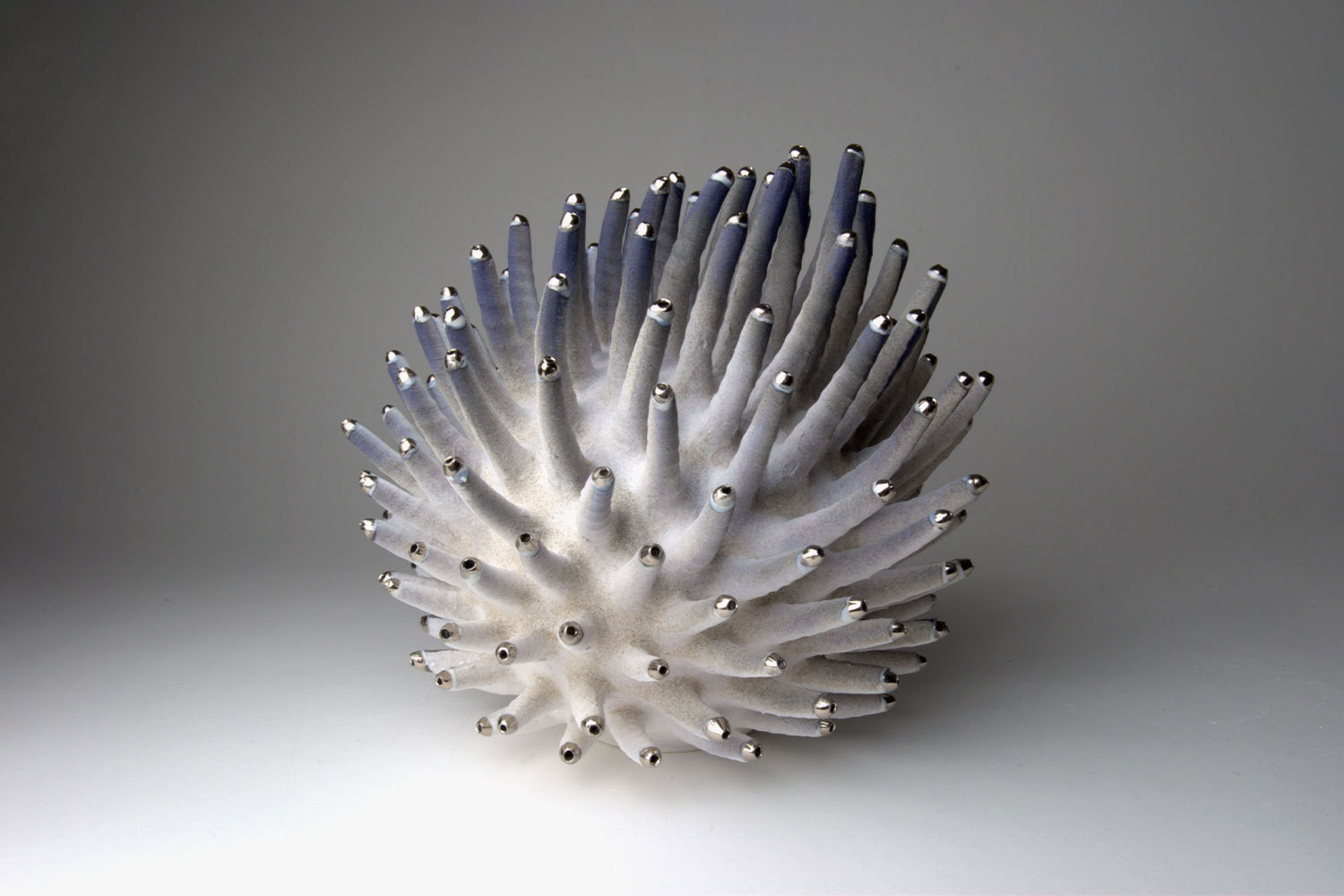In recent years, Eva's work has focused on a study of the golden ratio and a continued investigation into the Fibonacci sequence occurring in nature. Designed according to mathematical precepts, this thrown, altered and assembled porcelain sculpture explores the theme of recurrence, raising questions about the definition of harmony, asking why some forms are appealing and others are not. The tip of each protuberance has been finished with platinum lustre.