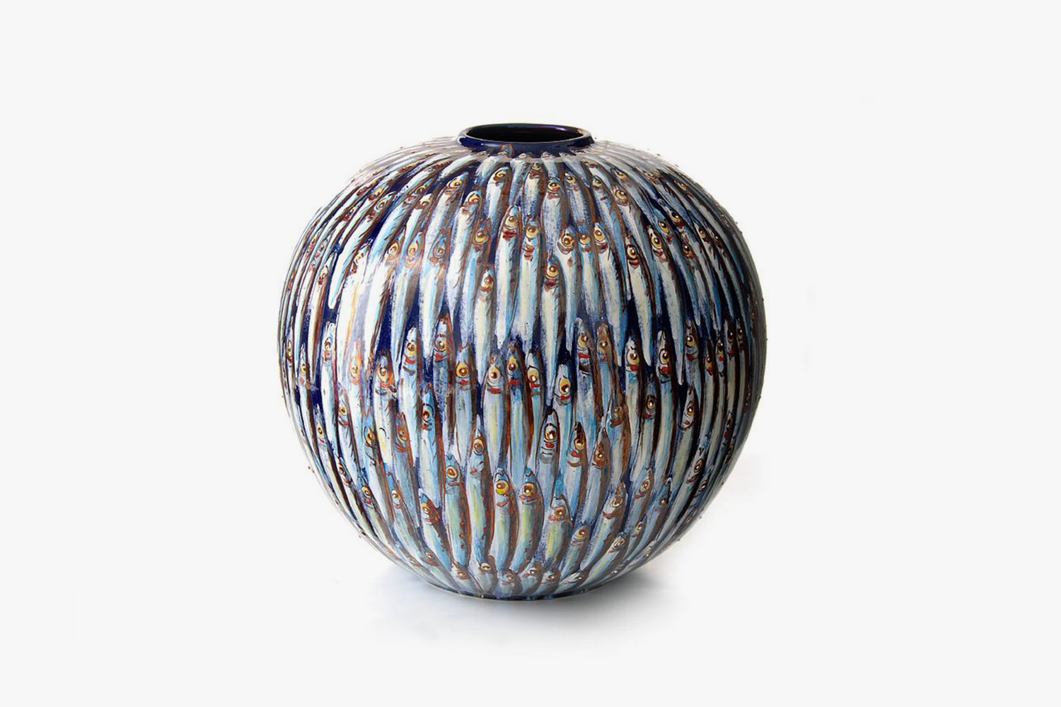 This fired earthenware vase is extensively decorated with an intricate blue fish pattern. The classically shaped vase was moulded on a potter's wheel and baked using the blast-fire reduction technique.