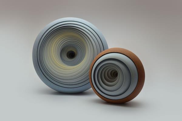 The dark stoneware shells of these handmade ceramic sculptures contrast with their pastel-coloured cores. The multiple visible layers were conceived and constructed using a mathematical methodology. The sculptures are not glazed but derive their colour from pigments that Matthew has previously incorporated into the clay.