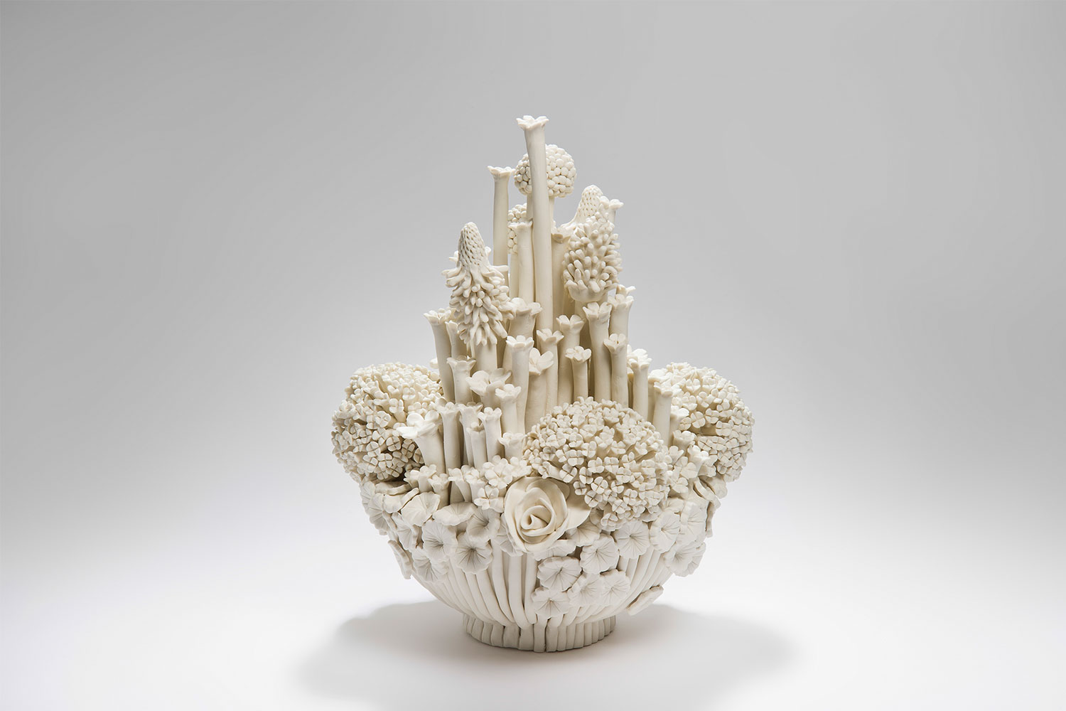Efflorescence, a sculptural abundance of porcelain flowers, are Vanessa Hogge's latest 2020 creations. The elegant ceramic sculpture was shaped using complicated hand-built techniques and a precarious balancing of porcelain flowers. This white porcelain vessel is intricately decorated with a cascade of hand-pinched porcelain flowers. The clay has been torn, pinched, rolled and cut to form simple petals that blossom and grow into complex symmetrical forms.