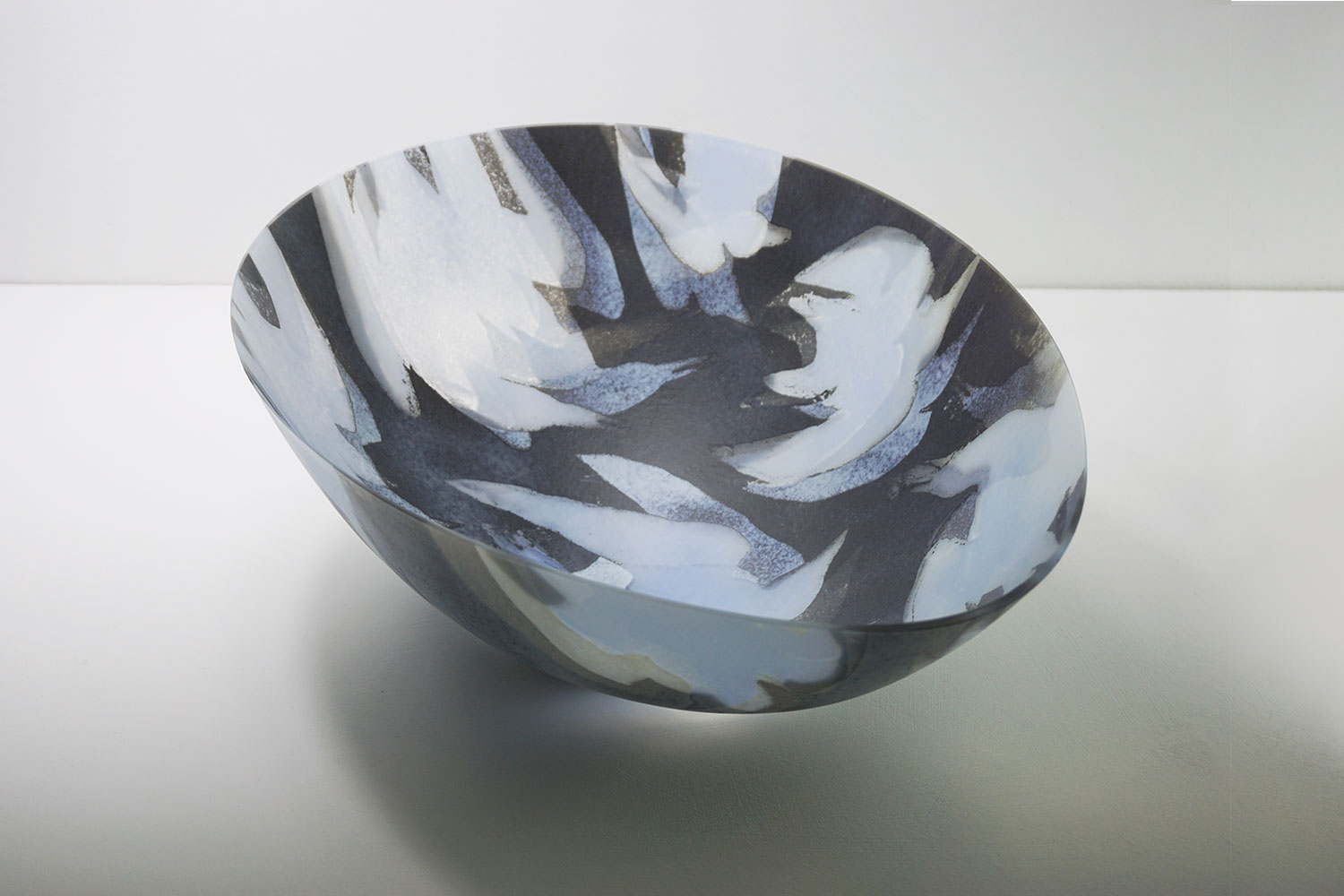 The surface of this bowl made from kiln-formed glass is decorated with a flock of white Arctic terns. The sea-blue shade of the glass evokes the terns' coastal habitat. Amanda has participated in research investigating the impact of sustainable energy on sea life, which inspired her to depict sea birds in her recent works.