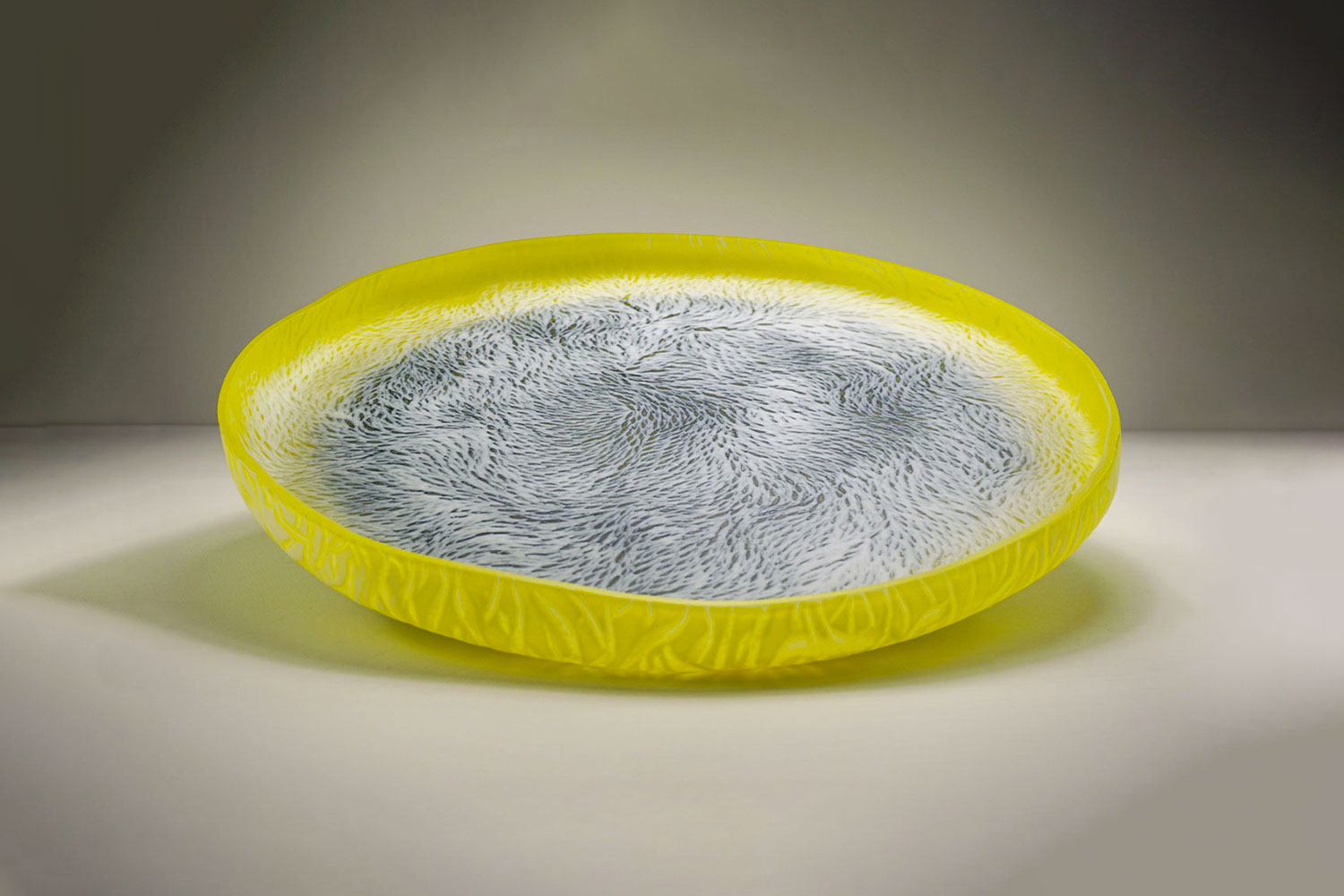This large kiln-formed platter was based on work developed while Amanda was in residency at North Lands Creative, Caithness, Scotland. The vivid, swirling patterns were inspired by the landscapes of this beautiful area, and evoke the markings and textures found on local stones.