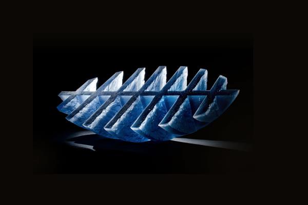This red glass sculpture was inspired by concave and convex curves, characteristic architectural elements of the Baroque period. The colour and transparency of glass play a very important role throughout Zora's work. While carrying out experiments with glass, Zora discovered an inspiring combination of metal alloy and melted glass that captured her attention due to it being both transparent and non-transparent, raw and glazed, heavy and light, all at the same time. Combining these two materials offers new possibilities.