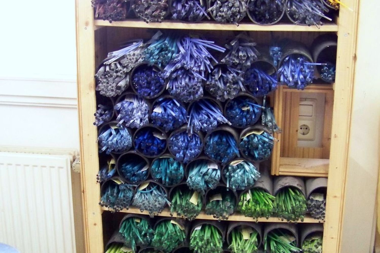 This dark coloured glass plate has been made by fusing different diameter glass rods together, creating a honeycomb design on the surface of the plate. This process of working reminds Gabriele of I-Kat weaving, an intricate style of dying and weaving fabric found along the Silk Road and throughout Asia.