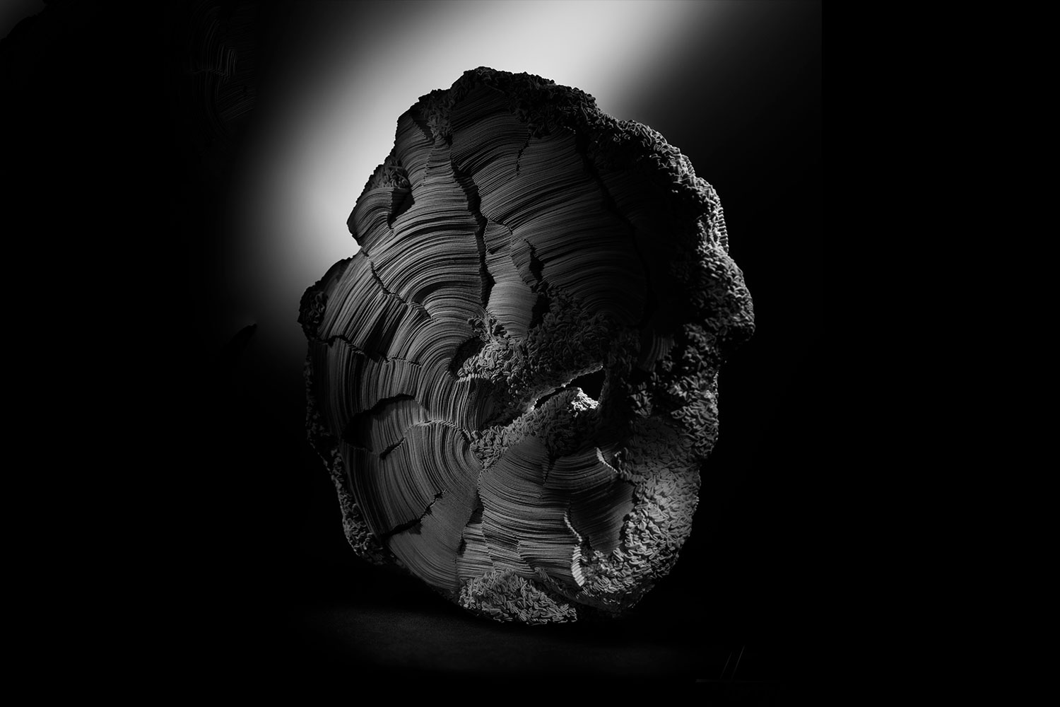Simone Pheulpin stacks and folds ribbons of unbleached woven cotton to create organic sculptures that express her affinity for nature and her poetic vision of the world. Like a solidified lava flow, the layers of folded fabric that make up Eclipse VI convey the idea of petrified movement. The work evokes rock crevices, sediments, prehistory and raw nature. The geologic shapes make us conscious of the era before mankind.