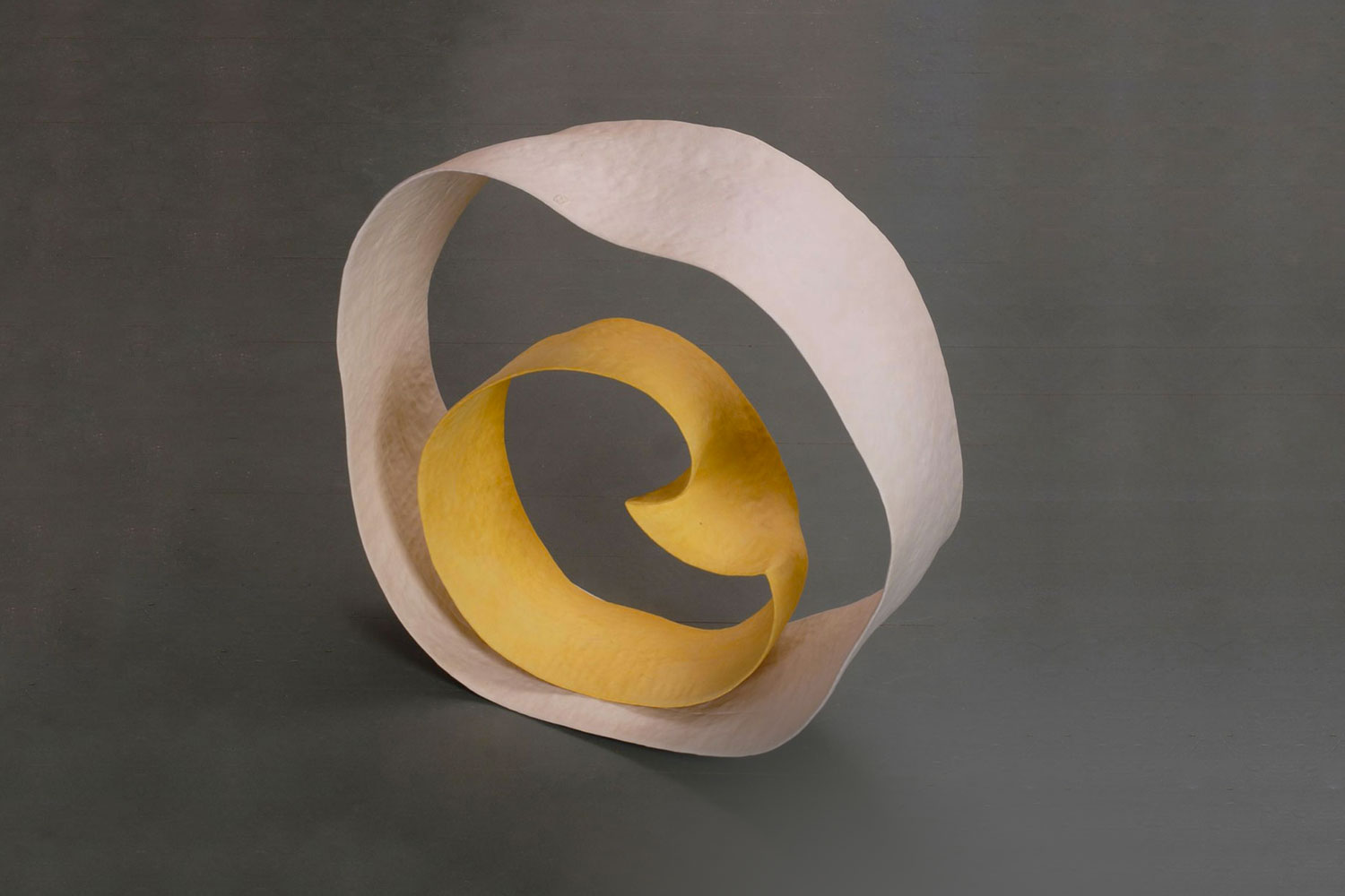 This ceramic sculpture is handmade from very thin strips of clay that have been flattened out and joined to form a hollow circular shape. A smaller yellow sculpture is placed within a larger white coloured ceramic sculpture. Theodora chanced upon the shape when creating a geometric and planned shape. Quite unintentionally, her ceramic creation distorted due to overheating and gave birth to this formal expression.