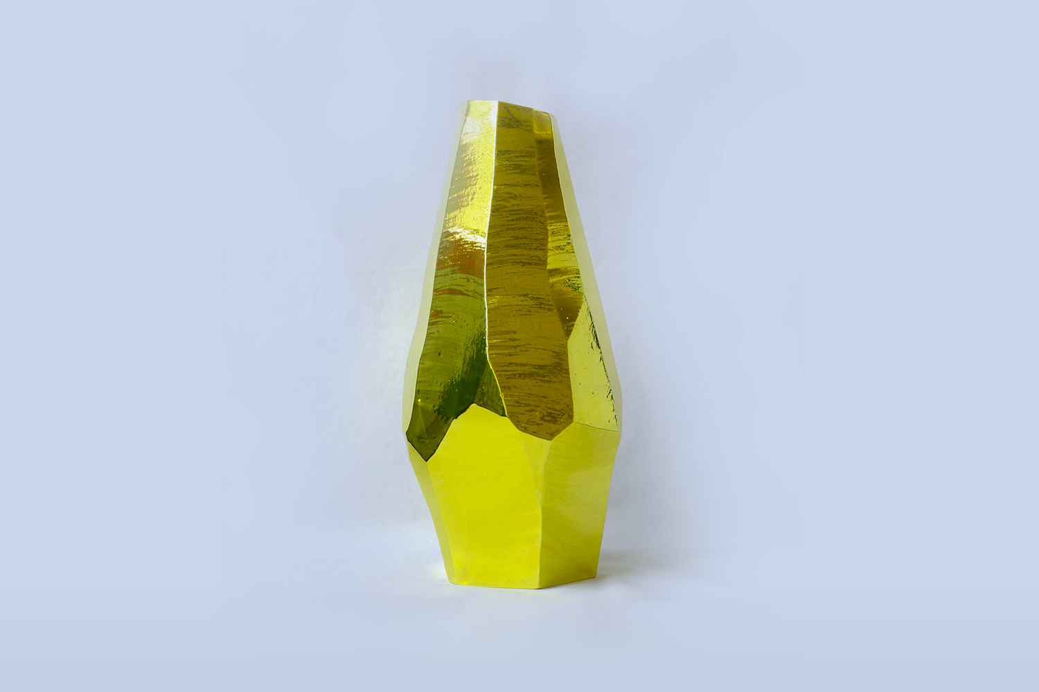 This tall ceramic vase with irregular facets was crafted from mixed clays in a plaster mould modelled from a polystyrene block. It was finished with a special yellow metallic mirror glaze.