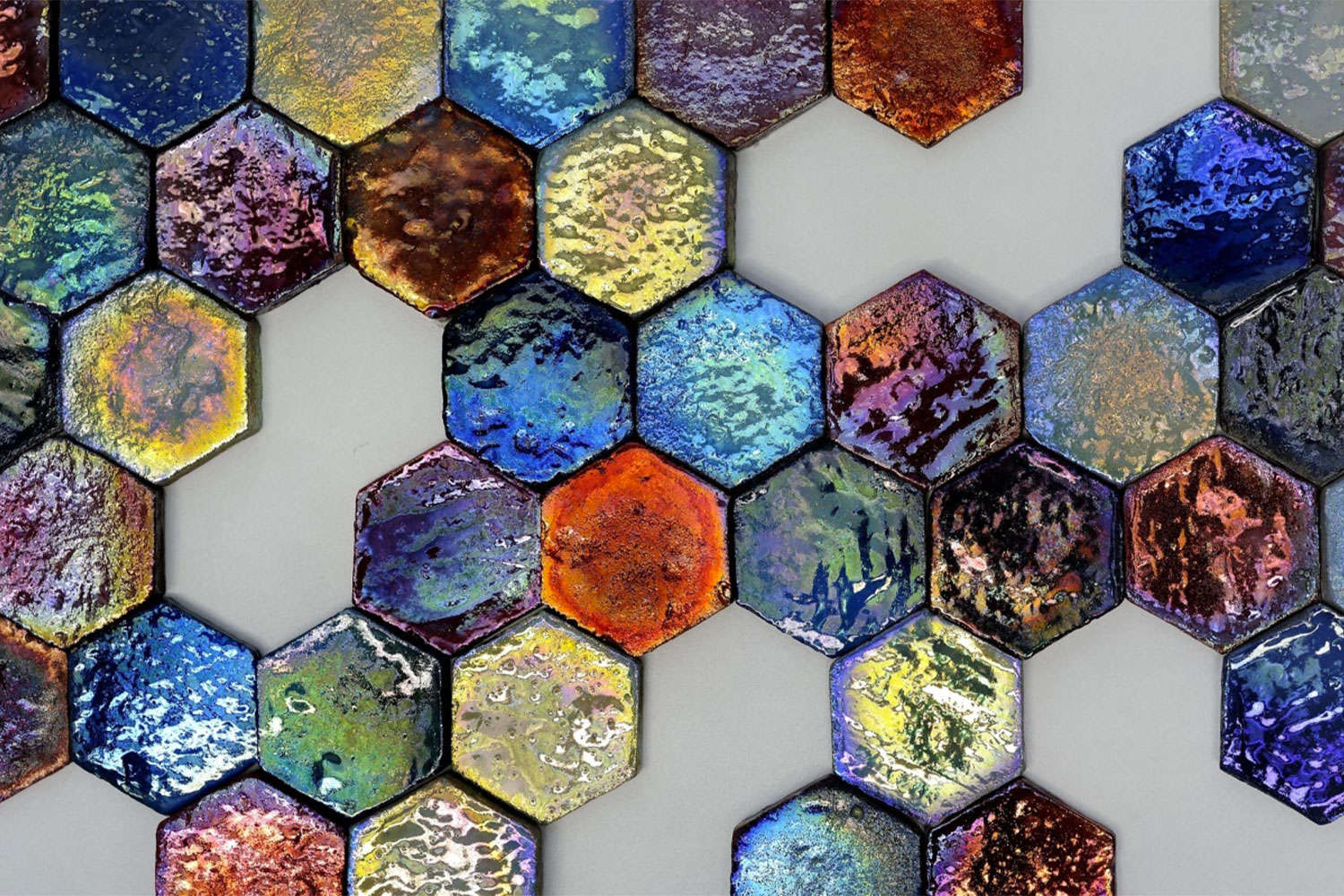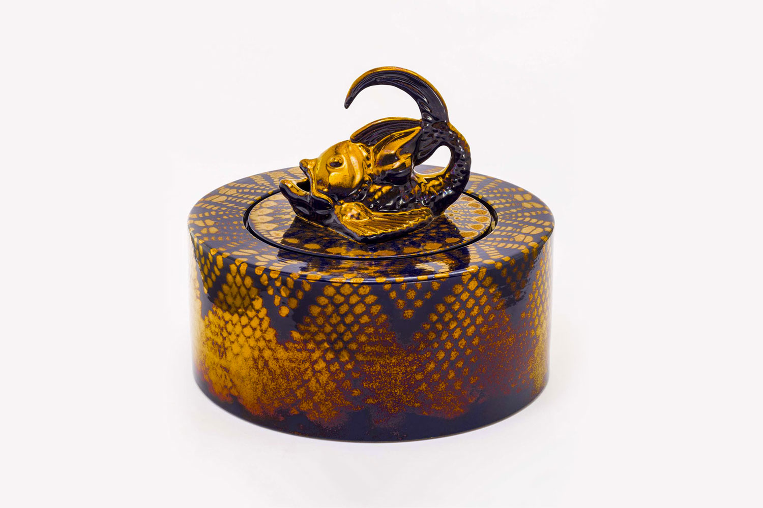 Two fish with curled fins adorn the lid of this scaly-looking orange and purple box. It was made using the lustre technique, in which a blend of metallic salts and controlled firing produce various iridescent and chromatic effects. The work received the First Choice Award at the International Ceramics Competition in Gualdo Tadino, near Perugia.