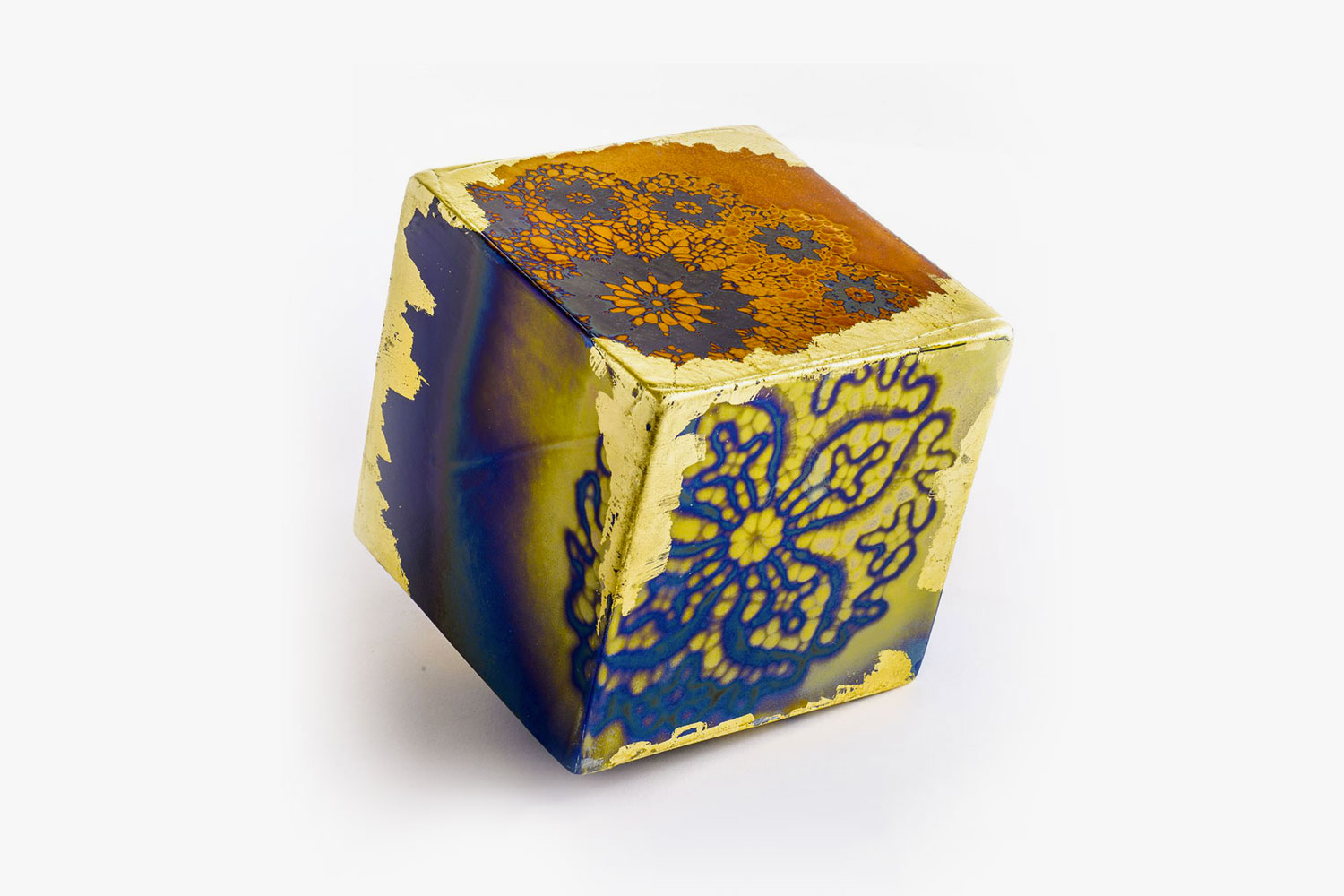This cube sculpture was decorated using the lustre technique, in which a blend of metallic salts and controlled firing produce various iridescent and chromatic effects. Floral patterns appear branded onto the surface. The work was part of the collective travelling exhibition of contemporary ceramics, “Cube - Compressi”, hosted in several Italian cities.